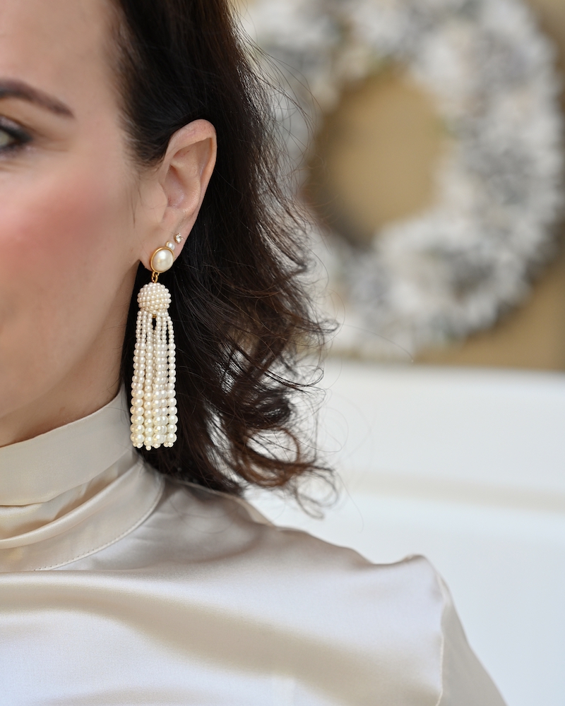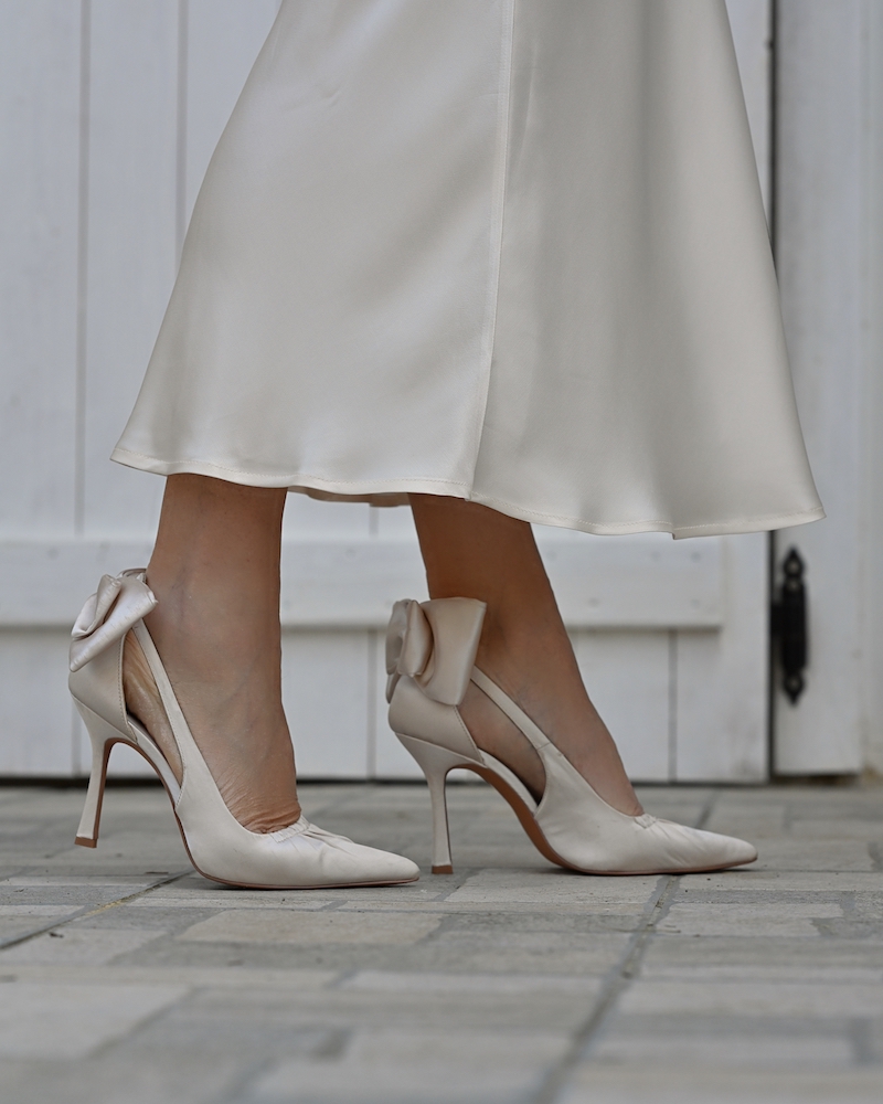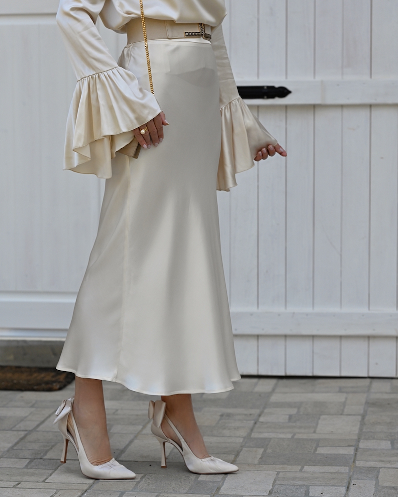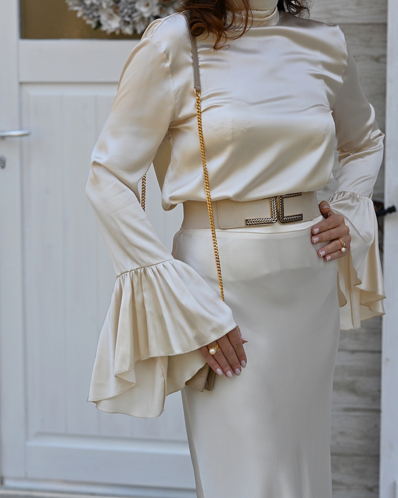 Današnji stajling je kot poezija v gibanju – popoln primer brezčasne elegance in ženstvenosti, ki govori v jeziku kakovosti. Izbrala sem svileno bluzo z edinstvenimi rokavi, ki nežno padajo ob rokah kot tančica svetlobe. Satenasto midi krilo v enakem slonokoščeno svetlem tonu dopolnjuje celoten videz s prefinjeno lahkotnostjo in klasično silhueto. Gre za stajling, ki ni le moden, ampak tudi premišljen. Vsak kos je izbran z namenom – da traja, da diha z nosilko in da ji daje tisti občutek samozavesti, ki pride, ko nosimo nekaj res vrhunskega. Svileni materiali niso le razkošni na pogled, temveč tudi prijetni na koži. Nositi svilo pomeni spoštovati svoje telo in občutiti modo na drugačni, globlji ravni. V svetu hitre mode, kjer kvantiteta pogosto prevlada nad kvaliteto, je prav takšna izbira samozavestna izjava. Investicija v kakovostne materiale se vedno povrne: v boljšem počutju, v trajnosti oblačil in v brezčasnem slogu, ki presega sezonske trende.