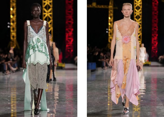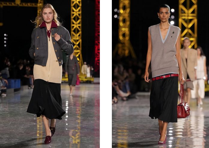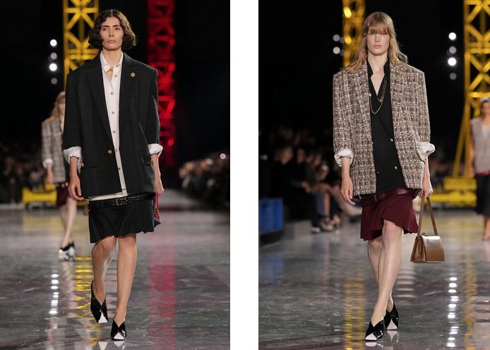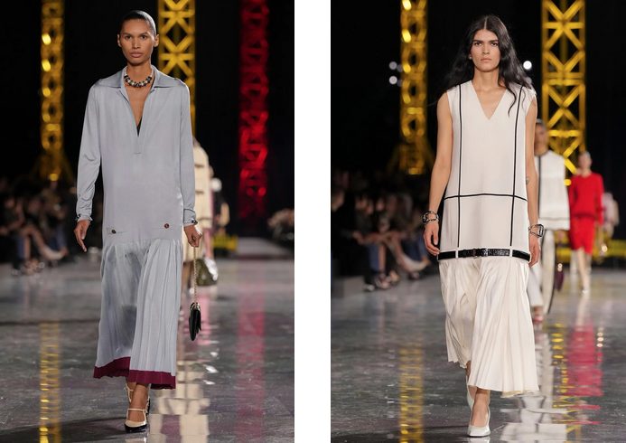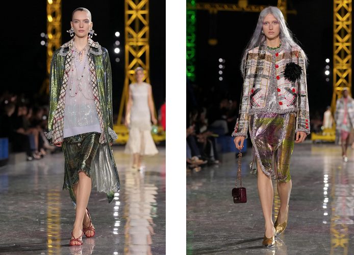 Na modni pisti v Grand Palais so prevladovali kosi, ki poudarjajo nizko pas in plisirane krila, spominjajoč na flapper dekleta iz zlatih dvajsetih. Ob tem so se pojavljali oversize blazerji in dolgi puloverji, ki so poudarili tekočo in dinamično žensko silhueto. Materiali so variirali od sijajnih do mat, z bogatimi teksturami, tridimenzionalnimi vezeninami in okraski iz perlic in kristalov, ki so kreacijam dodali posebno svetlikajočo noto.