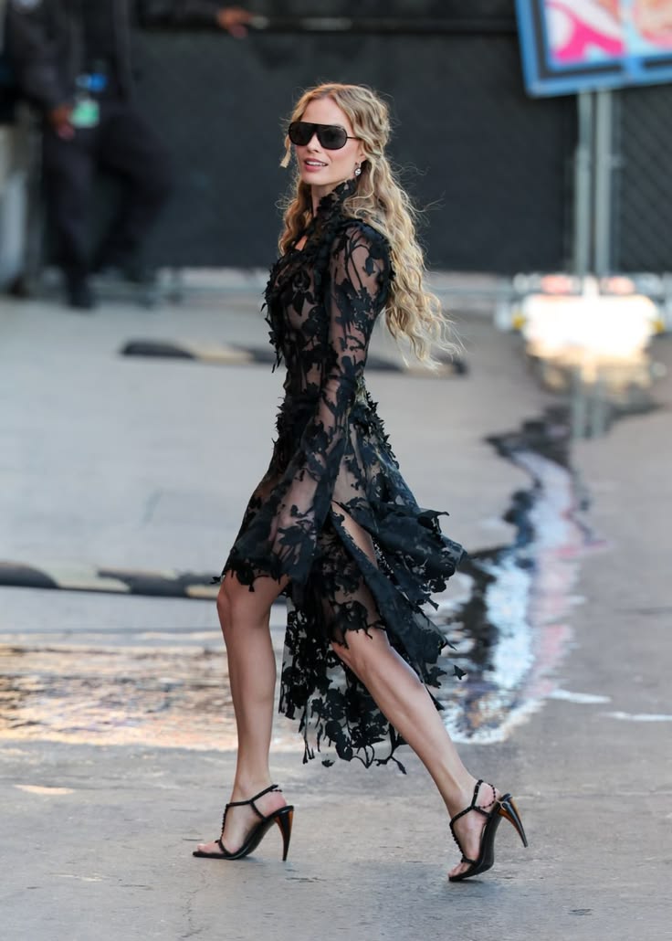 Pri promociji filma se je Margot Robbie odločila za silhuete, ki poudarjajo ženstvenost, a obenem nosijo dramatičen naboj. Črna čipka, strukturirani korzeti, dolge padajoče linije in subtilni viktorijanski detajli ustvarjajo občutek zgodbe – kot bi z rdeče preproge stopila naravnost na vetrovne planjave Yorkshira.