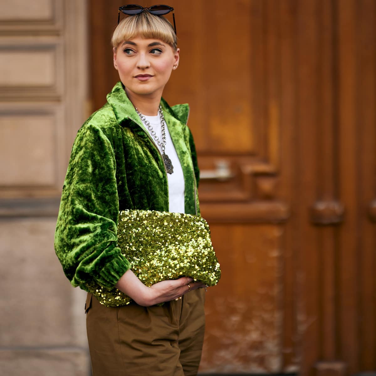 - Kot poudarek: če nisi pripravljena na popoln barvni preobrat, izberi dodatke – torbico, čevlje, nakit ali celo nohte v Dill Green odtenku.