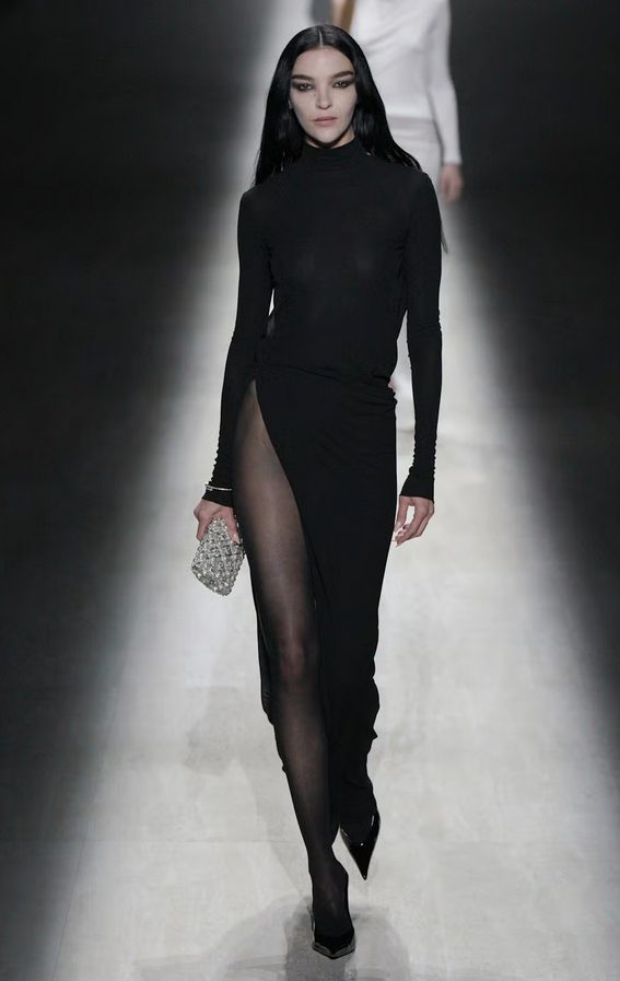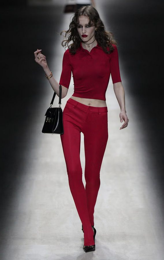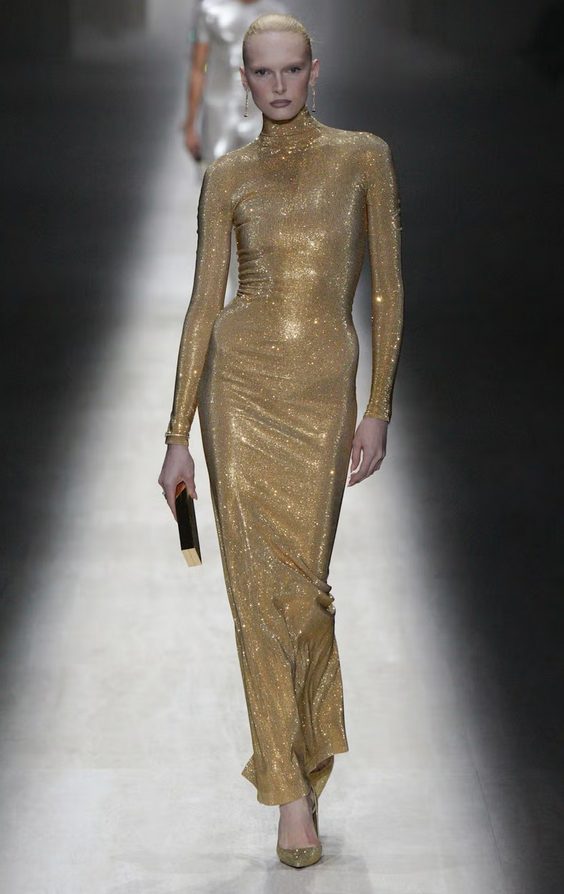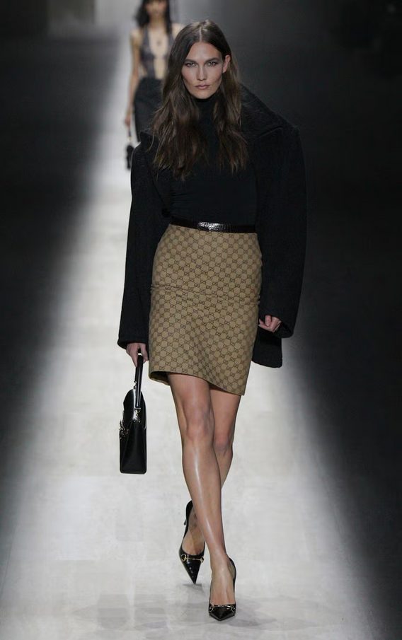 Silhuete so bile oprijete, pogosto provokativne, z močno energijo devetdesetih in zgodnjih 2000-ih. Mini obleke, korzetni kroji, bleščeče večerne silhuete in izraziti logotipi so spomnili na zlato obdobje Toma Forda, ko je Gucci prvič postal simbol samozavestne seksualnosti.