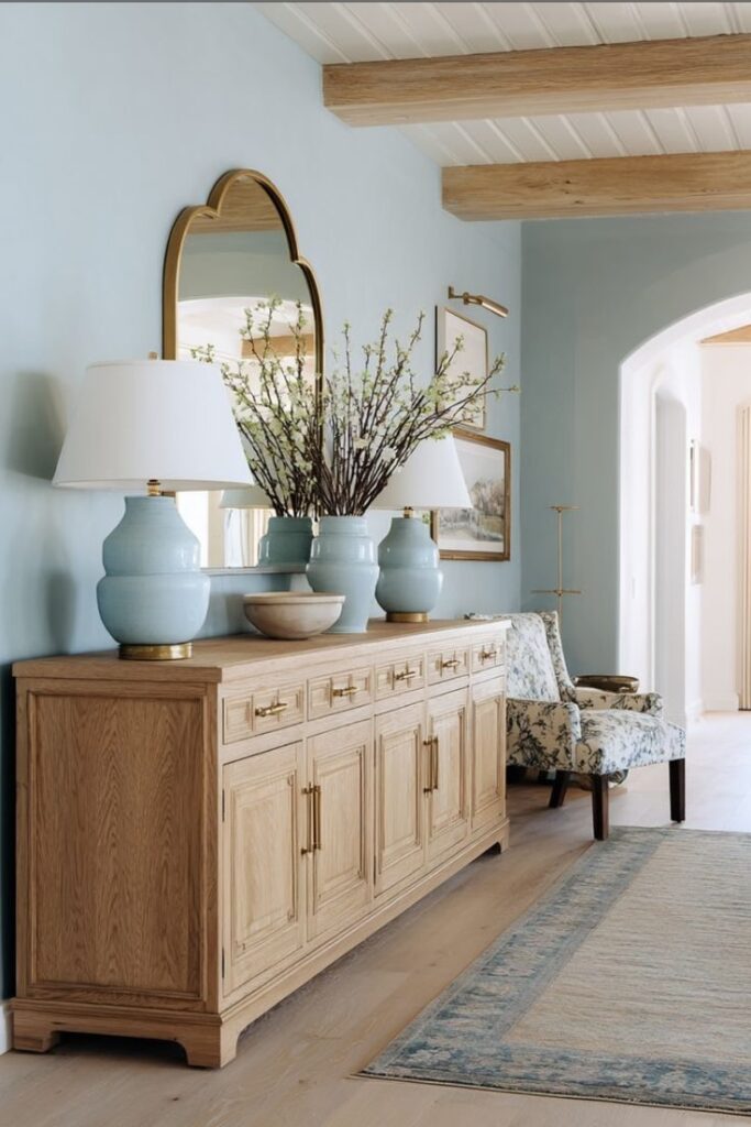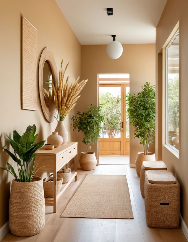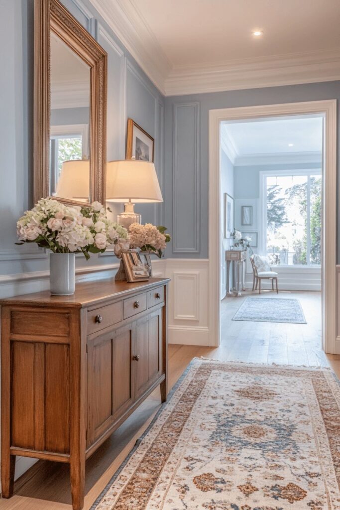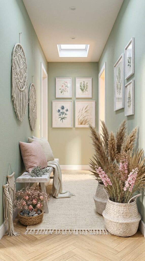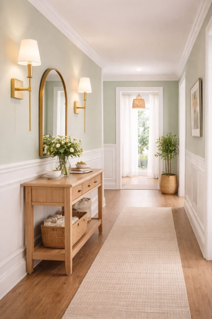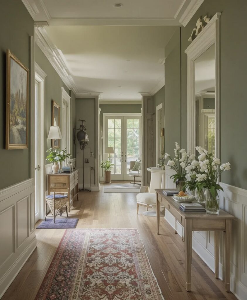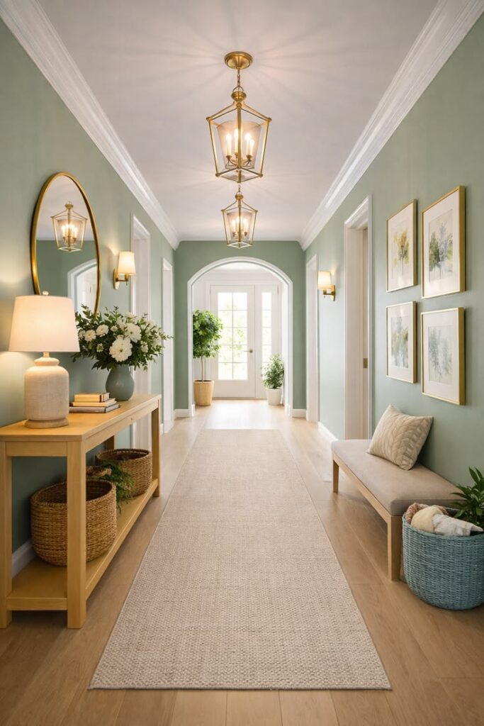 Najlepši učinek v hodniku dosežemo z barvami, ki prostor optično razširijo. Mehki bež odtenki, topla bela, svetlo peščena ali nežni sivi toni ustvarijo občutek miru in svetlobe. Če si želimo nekaj več karakterja, lahko eno steno poudarimo v bolj izraziti barvi – denimo olivno zeleni ali pudrasto rožnati – vendar vedno v ravnovesju s preostalim prostorom. Ogledala so tukaj skoraj nepogrešljiva. Ne le da so praktična, ampak podvojijo svetlobo in prostor, hkrati pa dodajo pridih elegance.