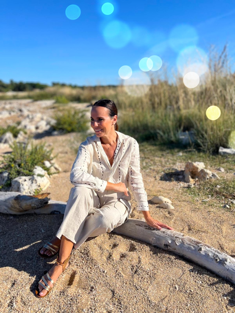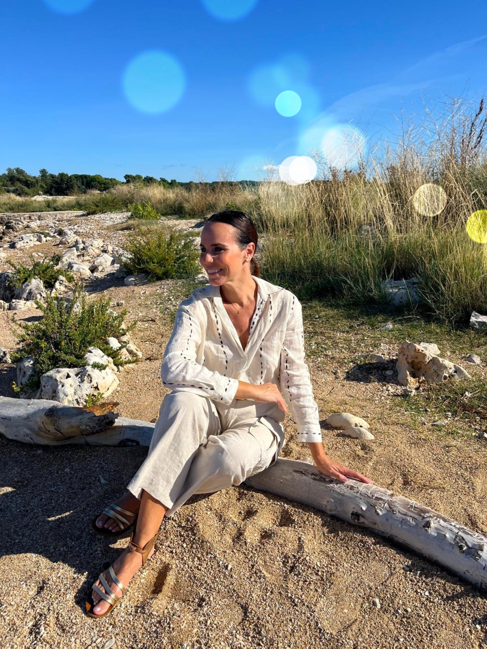 Ko sedim tukaj, imam občutek, da je svet ustavljen. Nobenih rokov, nobenih obveznosti, le sonce, ki se nežno nasloni na mojo kožo in mi poboža obraz, kot bi me hotelo spomniti, da sem živa in da je lepo biti. V laseh se mi zadržuje zlato; prav topla svetloba se ujame v pramene in jih obarva tako, da se počutim lahkotno, skoraj dekliško.