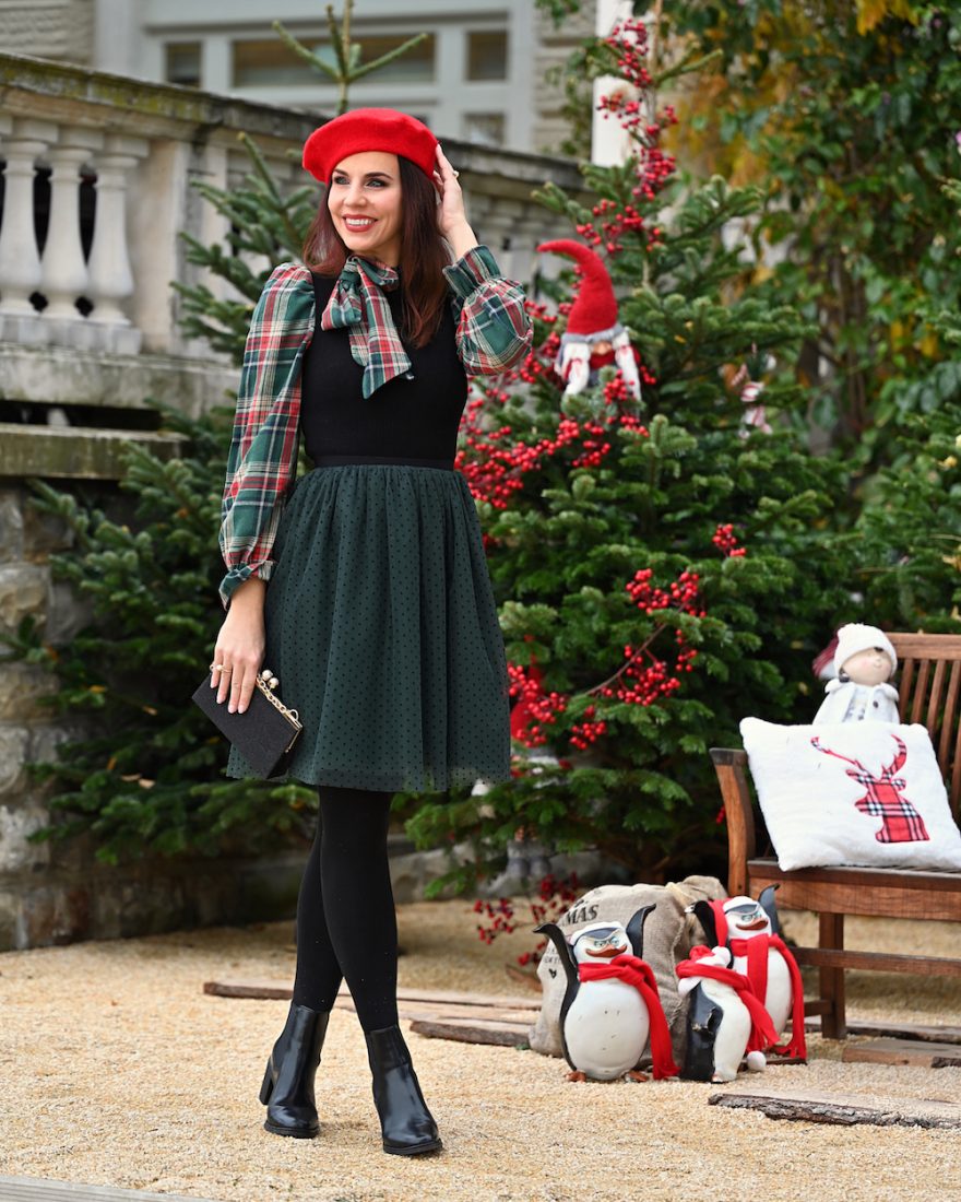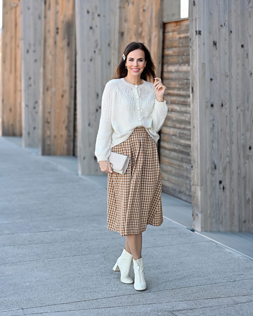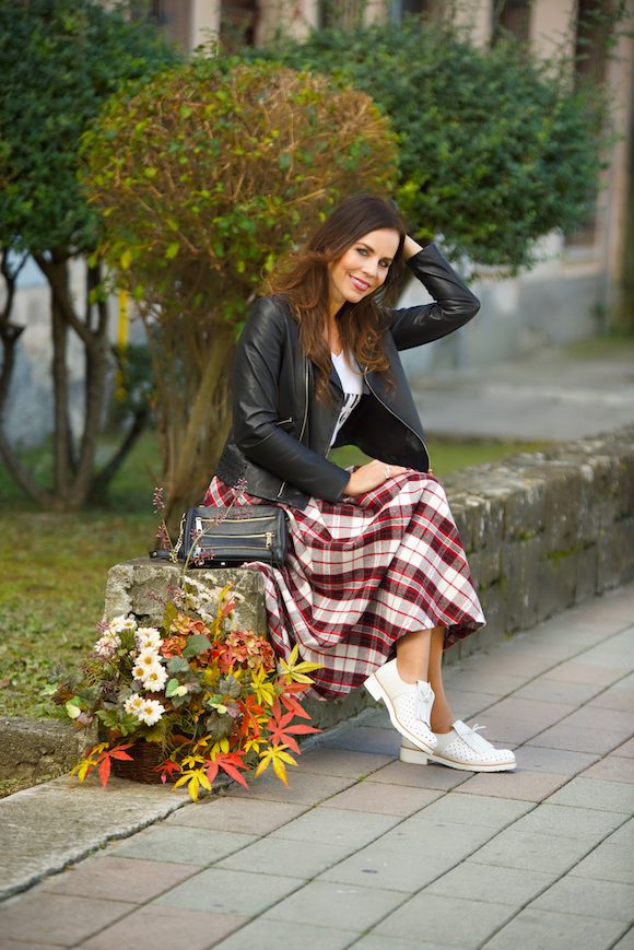 - Karo krilo + svilena bluza. Feminilna interpretacija karo vzorca, ki deluje zelo šik, še posebej z elegantnimi čevlji in minimalnim nakitom.