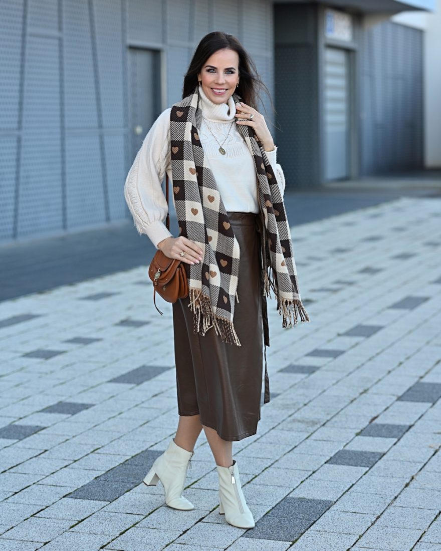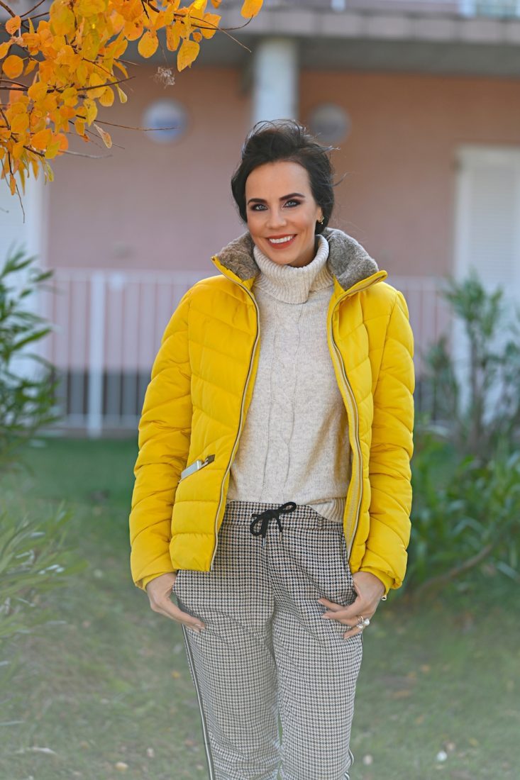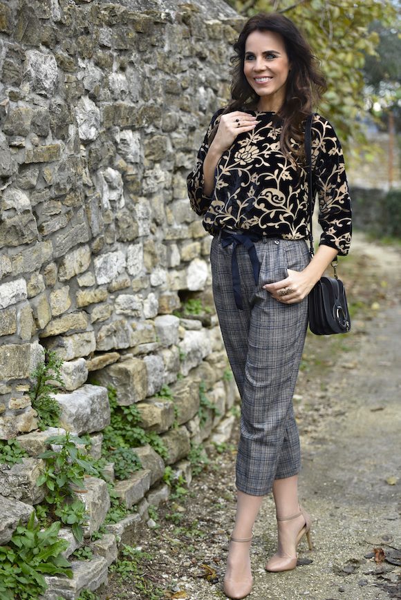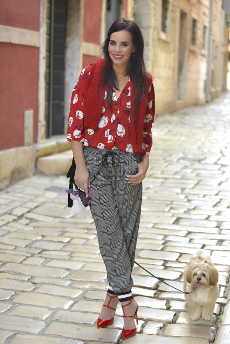 - Karo hlače z visokim pasom + mehka pletenina. Popolna kombinacija za jesen in zimo. Rada izberem pletenino v nevtralnem tonu, da vzorec pride do izraza.
