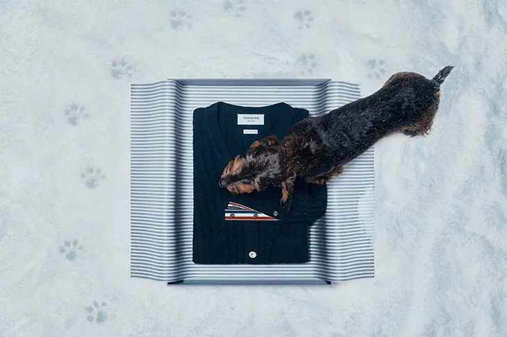 Tu je tudi Holiday kampanja hiše Thom Browne, kjer pa glavno vlogo modela seveda prevzema kreatorjev kuža Hector.