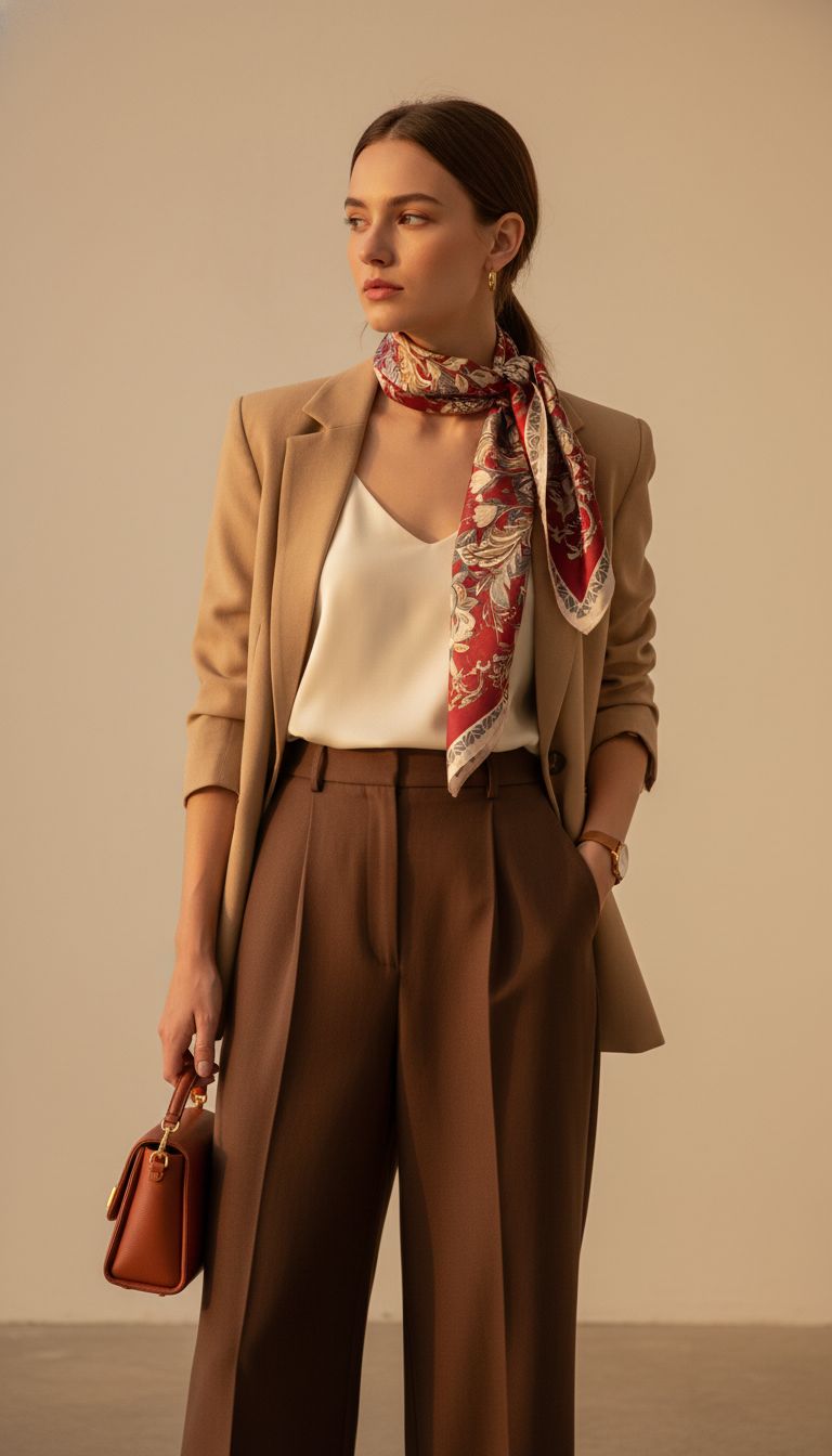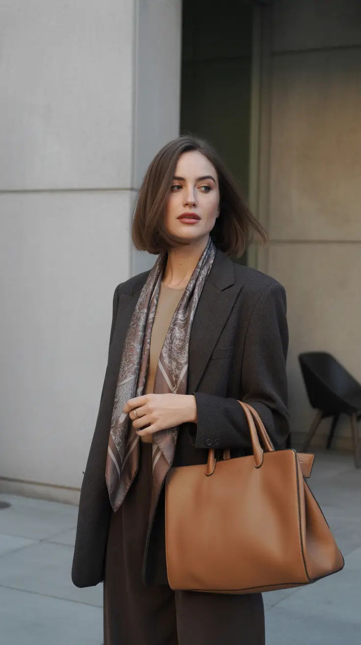 Ruta je eden tistih modnih dodatkov, ki jih pogosto podcenjujemo. V resnici pa lahko z njo ustvarimo zelo sofisticiran videz, saj prinese barvo, teksturo in osebni pečat. Ko jo kombiniramo z blazerjem, dobimo zanimivo ravnovesje med klasično eleganco in lahkotnim pomladnim občutkom. Prav zato je ta styling postal eden najbolj priljubljenih modnih trikov sezone.