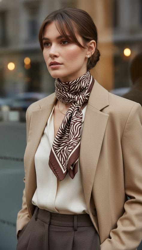 Majhna svilena ruta, zavezana tik ob vratu, ustvari zelo prefinjen videz. Posebej lepo deluje z enobarvnimi blazerji v nevtralnih tonih, kot so bež, bela, siva ali svetlo modra.