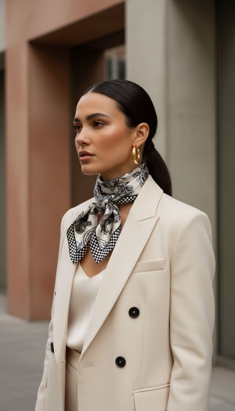 Včasih je za popolnoma nov videz potreben le majhen detajl. Prav to dokazuje eden najbolj elegantnih modnih trikov te pomladi: kombinacija blazerja in svilene rute. Gre za preprost, a zelo učinkovit styling, ki lahko tudi najbolj klasičen outfit spremeni v nekaj posebnega.