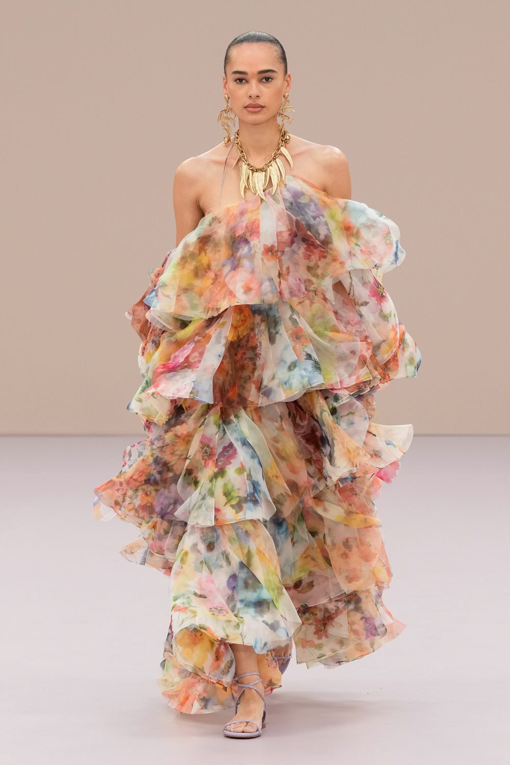 Začetek v pastelnih tonih, s prosojnimi materiali in čipko, se je razvil v bogatejše teksture, v mahovno zeleno, temno modro in tople zemeljske barve. Vse skupaj je delovalo kot zgodba – od jutra do mraka, od sanj do realnosti. Zimmermann je ustvaril čutno, introspektivno kolekcijo, kjer vsaka obleka pripoveduje o preobrazbi.