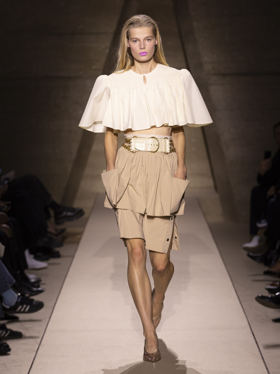 Občutek sedemdesetih let, s kapami, čipkami in lahkotnimi plašči, je povezan z današnjim ritmom – za žensko, ki se ne odreka lepoti, a potrebuje praktičnost. To je bila Chloé, ki diha preteklost in gleda naprej.