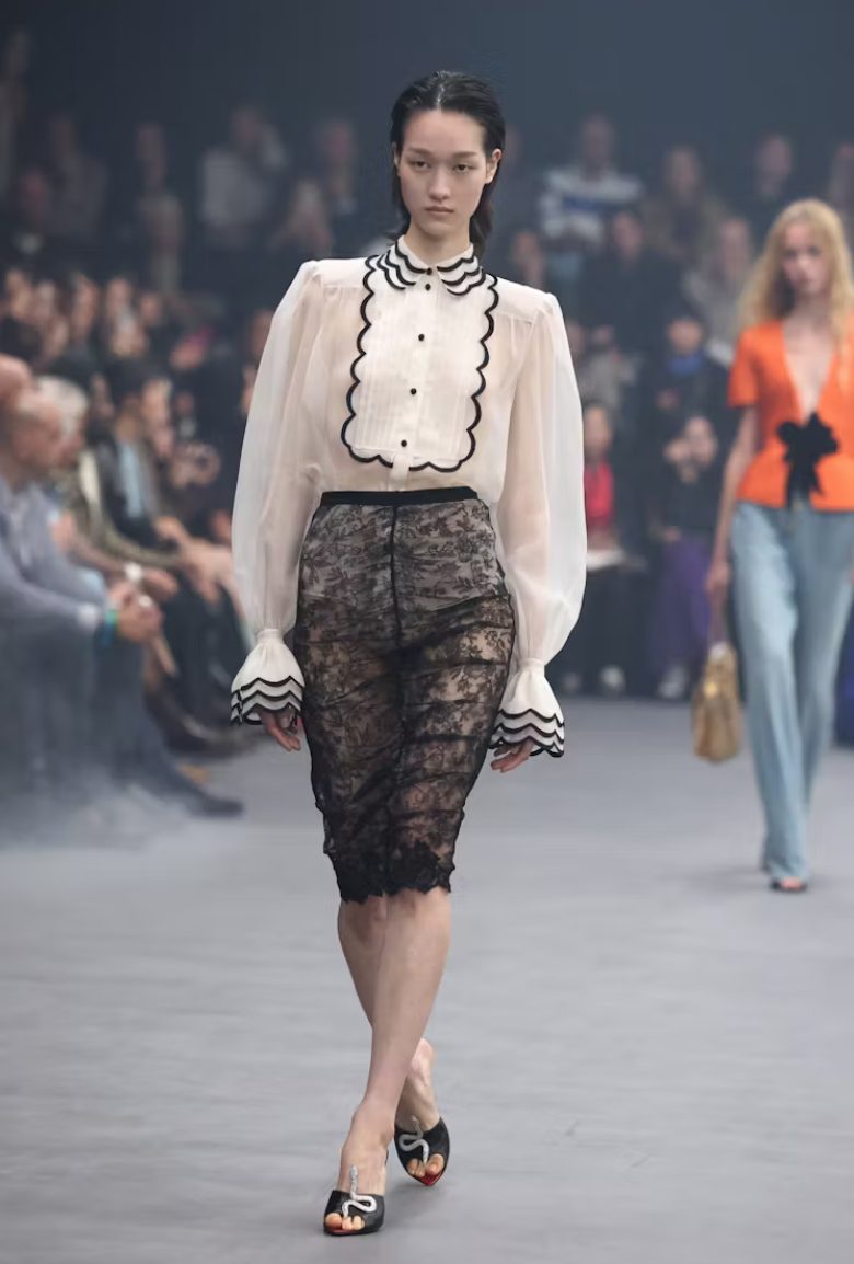 Chemena Kamali je ponovno ujela tisto, zaradi česar Chloé ostaja sinonim za svobodo in nežnost. Njena kolekcija je bila kot pesem v cvetju – potiski z drobnimi cvetlicami, pastelni odtenki, silhuete, ki dihajo. Tkanine so se premikale z zrakom, vse je bilo romantično, a sodobno.