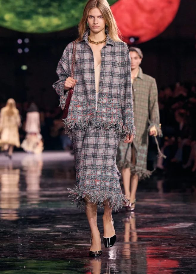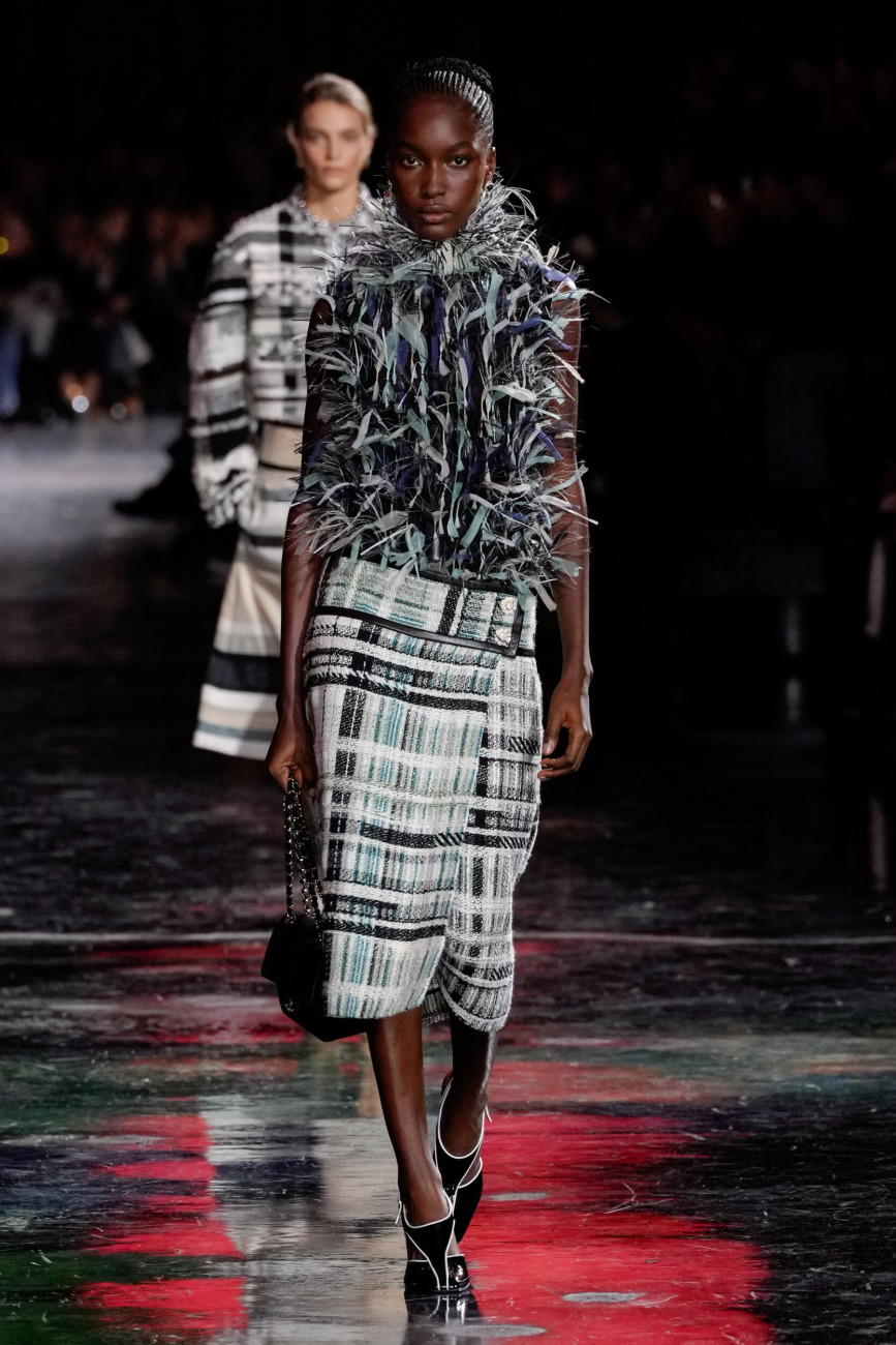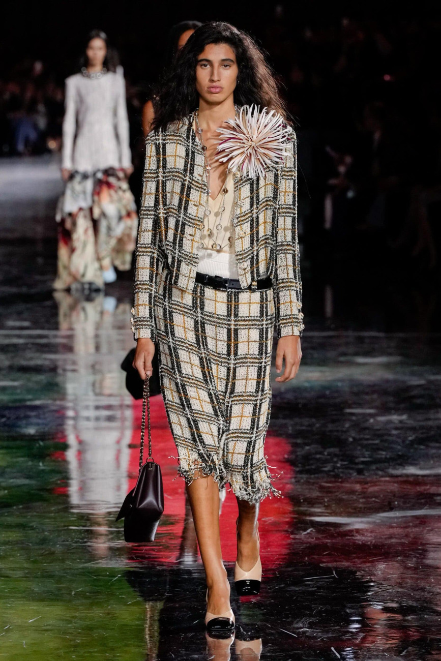 Chanel ima tako veliko moč, da uspe poravnati celo planete, seveda simbolično, a včasih tudi konkretno. Po mesecih priprav je Matthieu Blazy predstavil zelo pomlajeno blagovno znamko s predstavo v Grand Palaisu, ki je bila hkrati spektakularna in nepričakovano intimna. Novopečena (ponovno) imenovana ambasadorka blagovne znamke Nicole Kidman se je v spremstvu hčera Sunday Rose in Faith Margaret pridružila zvezdnikom, vključno z Margot Robbie, Penélope Cruz, Ayo Edebiri in Pedrom Pascalom, v nedavno prenovljeni stavbi iz stekla in jekla, ki je bila preurejena v planetarij, kot simbol »vesolje Chanela«. Vsi dobro vemo, kako je bila Coco navezana na planete in astrologijo, zato se je veliko vrtelo okoli tega koncepta. Velikanske krogle, ki so se zrcalile v bleščečih črnih tleh, marmoriranih z barvnim pigmentom, so ustvarile nadnaravno ozadje, ki je spominjalo na najbolj spektakularne predstave Karla Lagerfelda. Svojo prvo sezono je Blazy opisal kot »vlakec smrti« in dejal, da ga je arhiv sprva prevzel. »Lepote je bilo skoraj preveč in nisem vedel, od kod naj jo vzamem,« se je spominjal. »Dobra stvar pri Chanelovih kodah je, da jih lahko tudi poenostaviš. Še vedno so videti kot Chanel.«
