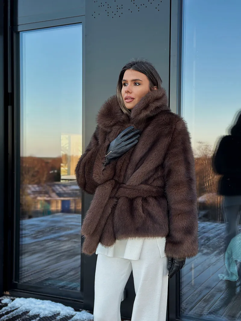 Največja prednost takšnega plašča? Deluje kot celoten stajling sam po sebi. Ne glede na to, ali ga oblečete čez trenirko ali bleščečo večerno kombinacijo, učinek bo vedno pravi. Idealen je za praznično sezono, pa tudi za tisti nekoliko lenobni čas med obilnimi kosili in sladkarijami, ko si še vedno želite videti urejeno in samozavestno. Barva sezone je brez dvoma čokoladno rjava, zato ni presenetljivo, da prevladuje tudi pri umetnem krznu. Rjav plašč deluje elegantno in naravno, še posebej v kombinaciji s karirasto srajco, sproščenim krilom in škornji do kolen. Popolno ravnovesje med vsakdanjim in sofisticiranim.