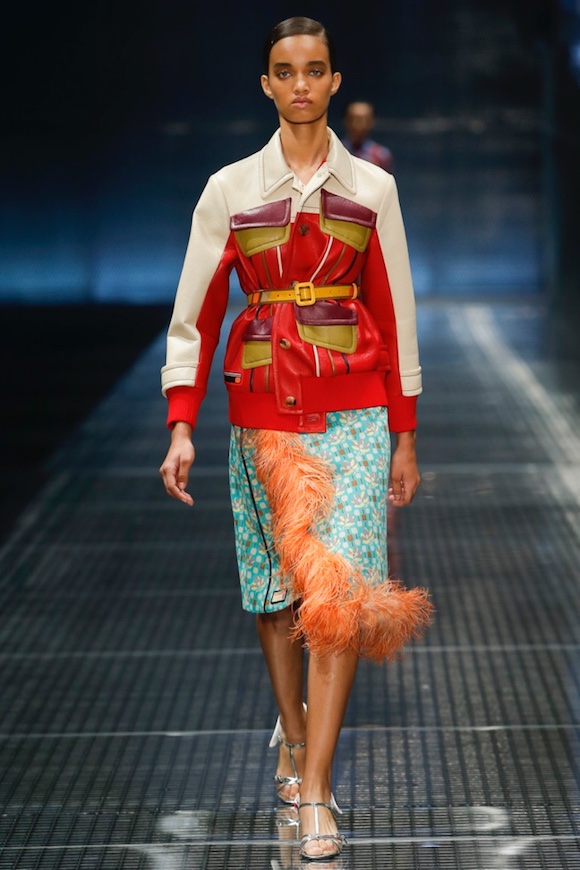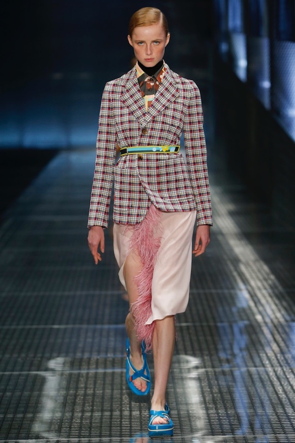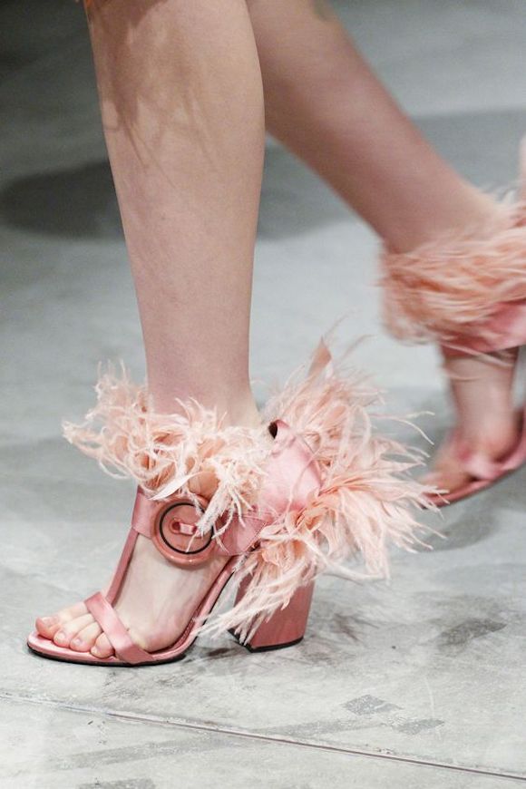 Perje je lahko različnih vrst, včasih je umetno, drugič ne. V Pradini kolekciji najdemo čudovite kose, ki lahko postanejo navdih; osebno me navdušujejo robovi na svilenih, pudrastih oblekah, skoraj vedno ton na ton, čeprav so tukaj tudi kontrastne različice, vsekakor bolj opazne. Malo si poglejte tope iz perja, saj jih lahko kombinirate z elegantnimi hlačami ali preprosto z jeansom, v tem smislu gre za odličen kontrast, ki vam bo všeč. Naj omenim tudi sandale brez paščkov na zadnji strani, ki spominjajo na natikače s peto za v spalnico, čudovito retro in sočno seksi … No, niso najbolj udobni in praktični za hojo, a tu in tam si jih lahko privoščimo, za kakšen poseben dogodek.