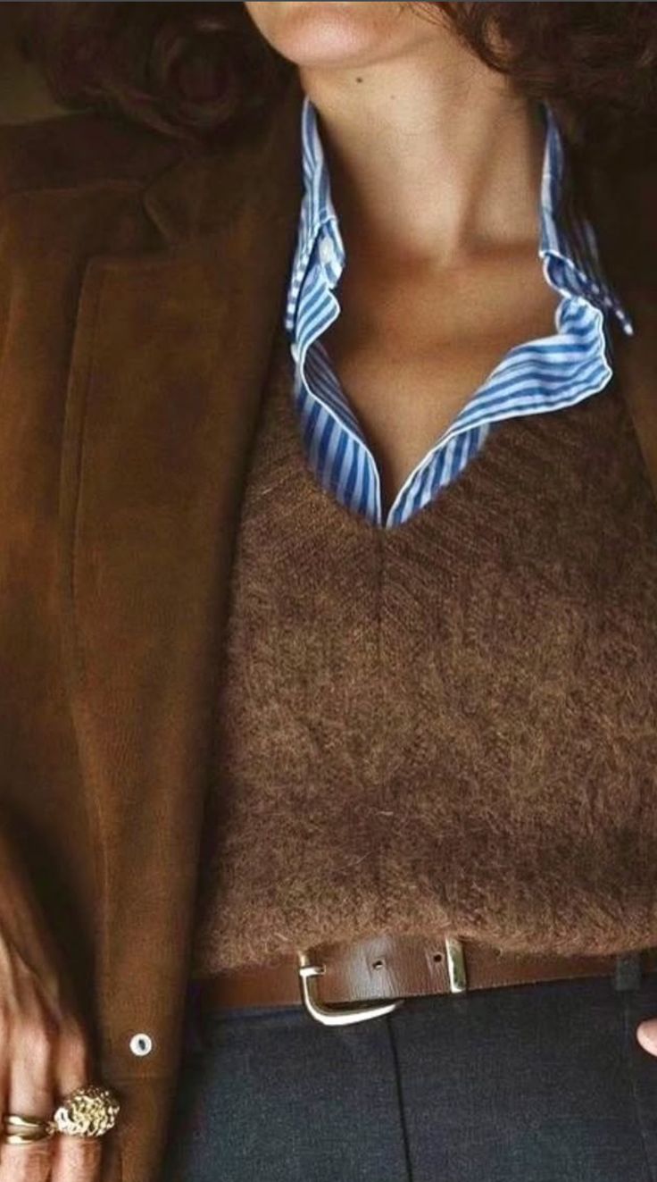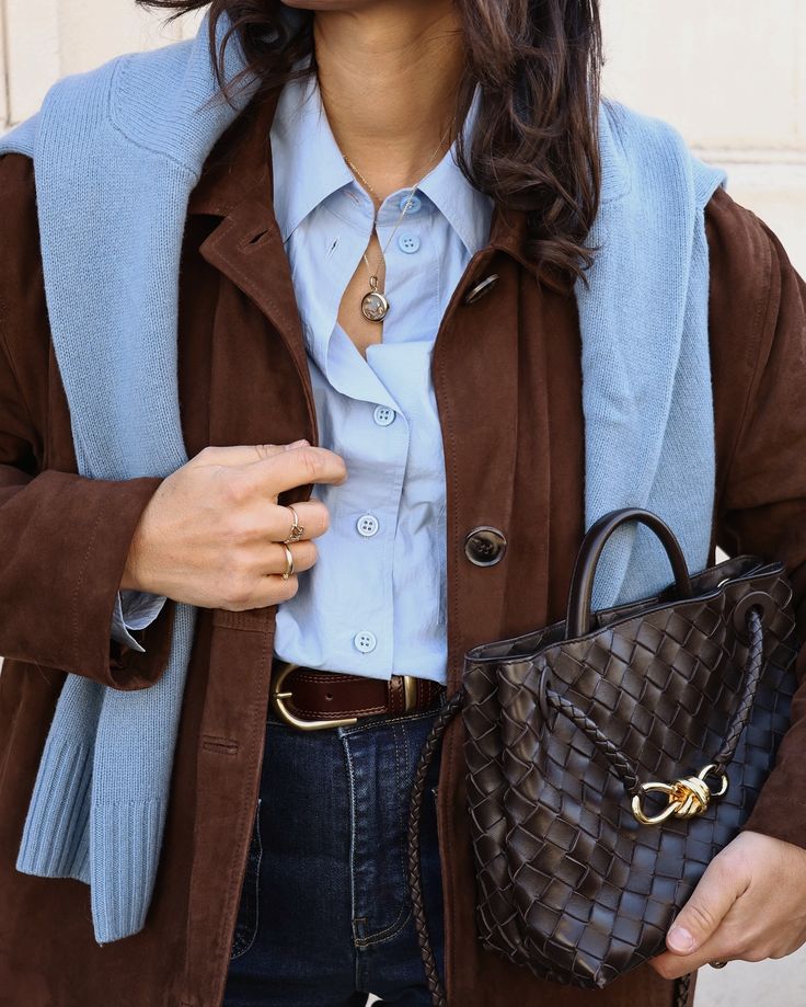 Rjava in modra sta vsaka zase že dolgo v modnem kanonu. Modra kot simbol sproščenosti, nebesne jasnine in denim estetike; rjava kot barva zemlje, topline in naravnih tekstur. Ko jih združiš, se zgodi nekaj zelo prijetnega: hladna modra dobi globino, rjava pa pridobi svežino. Ta kontrast deluje kot tiha, a močna izjava: eleganca ni vedno v ekstremnih barvah, temveč v njihovi harmoniji.