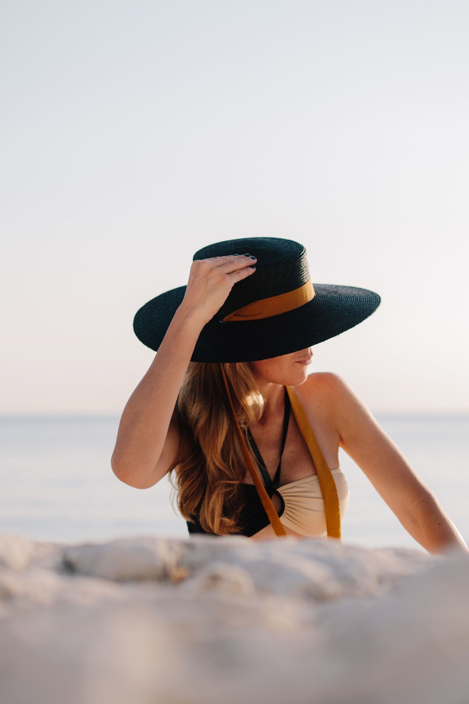 • S širokim robom, ki elegantno zasenči obraz – popoln za sprehod po obali ali brunch v senci dreves.