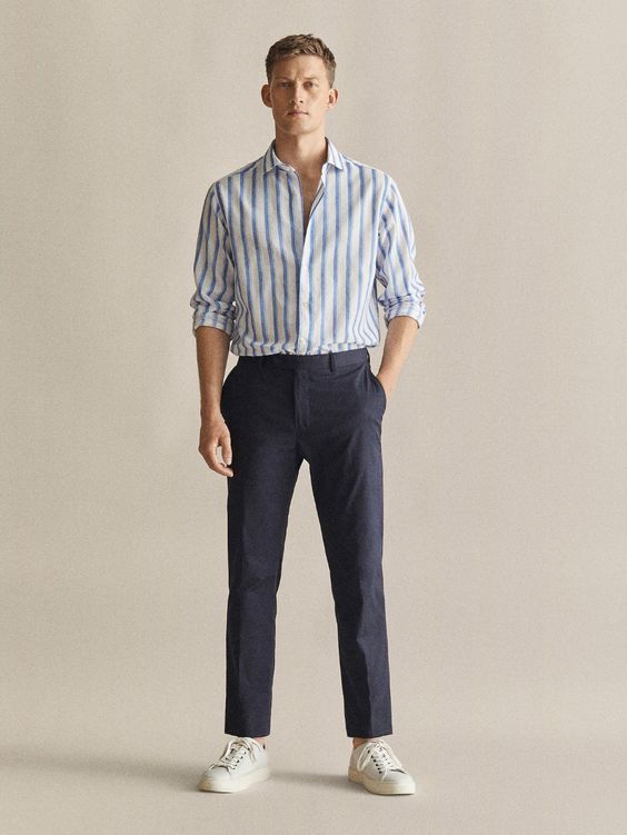 Lanena srajca je nepogrešljiva v toplejših mesecih. Njena rahla zmečkanost ni napaka, temveč značaj. Deluje lahkotno, mediteransko, sofisticirano brez napora. Izbirajte modele z mehko konstrukcijo in naravnimi odtenki – bela, peščena, svetlo modra, olivna. Pomembno je, da lan ni pretanek, saj mora ohraniti strukturo.