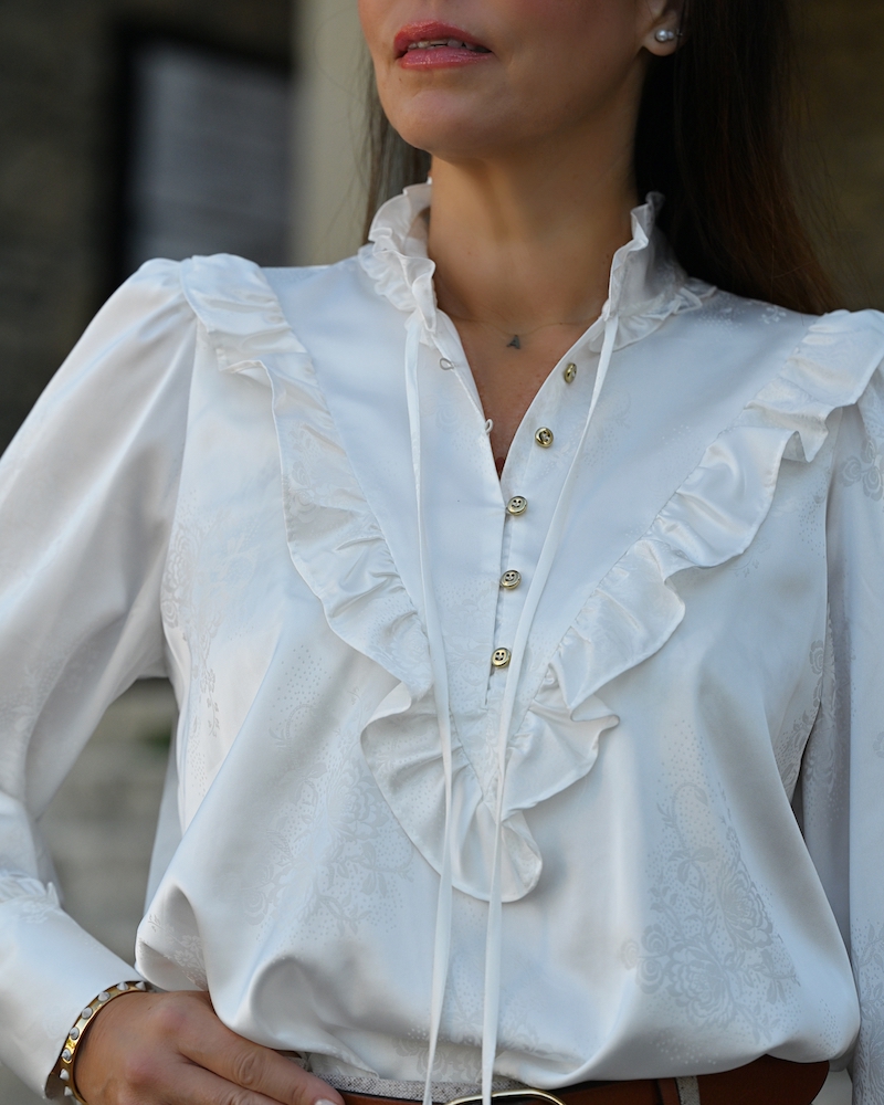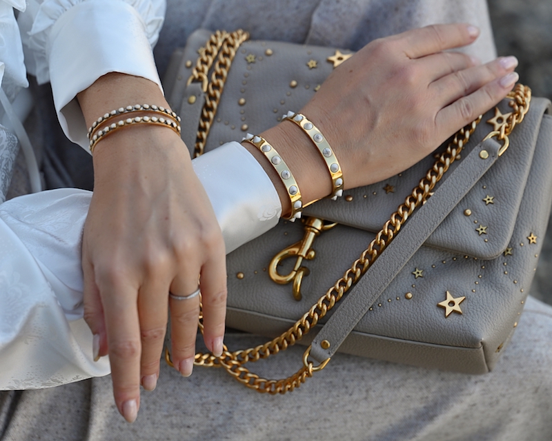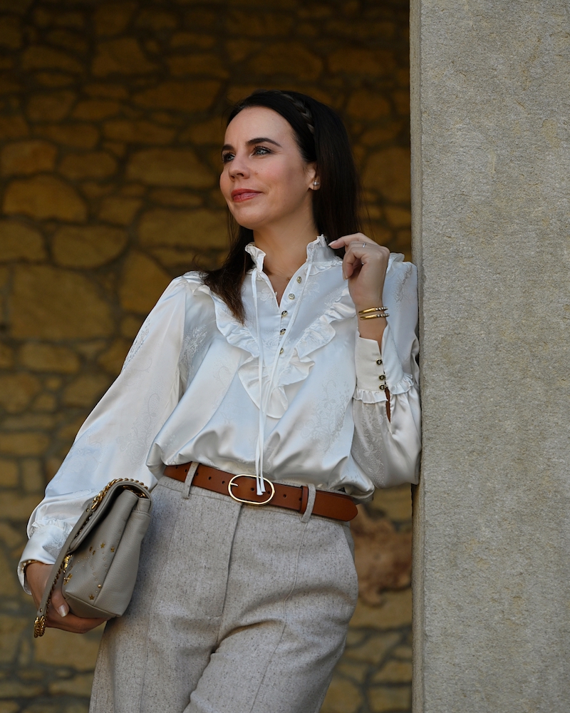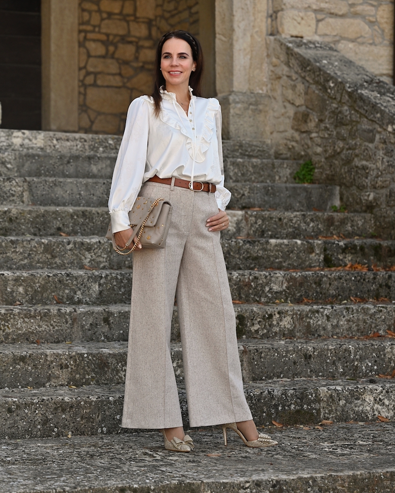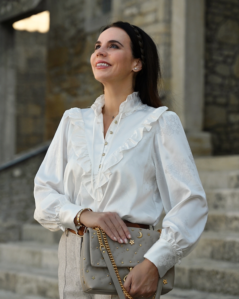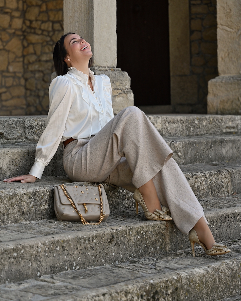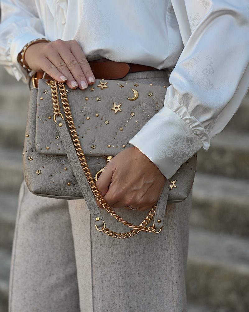 Včasih si za popoln videz ne želimo pretiranega glamurja – dovolj je nekaj izbranih kosov, ki se med seboj harmonično dopolnjujejo. Tokrat je v ospredju klasična kombinacija širokih volnenih hlač v nežno bež barvi ter bele potiskane bluze z mehkimi, majhnimi volančki. Gre za silhueto, ki jo odlikujeta udobje in sofisticiranost, zato je primerna tako za vsakdanji korak po mestu kot tudi za bolj slavnostne trenutke. Širše hlače iz volne prinašajo občutek razkošja, obenem pa ustvarijo graciozno linijo, ki lepo zaokroži postavo. Ko se jim pridruži rahlo romantična bluza z volančki, nastane ravnovesje med strukturo in lahkotnostjo – močno ter nežno, natančno tako, kot se rada počuti sodobna ženska. Kombinacijo nadgradijo zlate čevlje, sijoč poudarek, ki subtilno ujame svetlobo in videzu doda pridih glamurja. Piko na i prinese torbica Rebecca Minkoff, posuta z motivi lune in zvezd. To je več kot le modni dodatek – je simbol, ki nas opomni, da je mogoče prav vse. Naj bo talisman za nove priložnosti, izzive in sanje, ki se šepetaje skrivajo v ozadju vsakega dne.