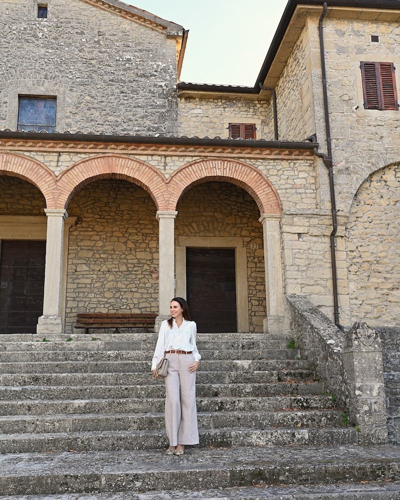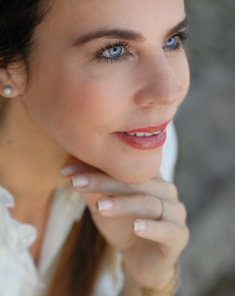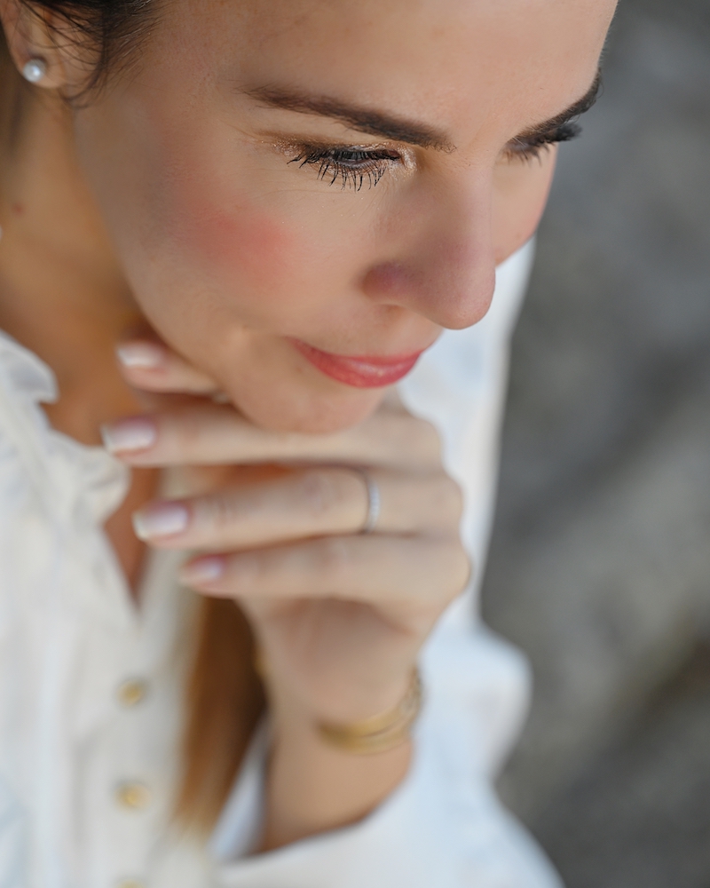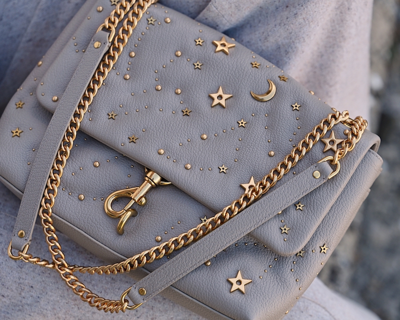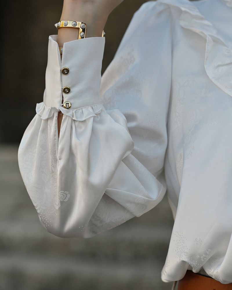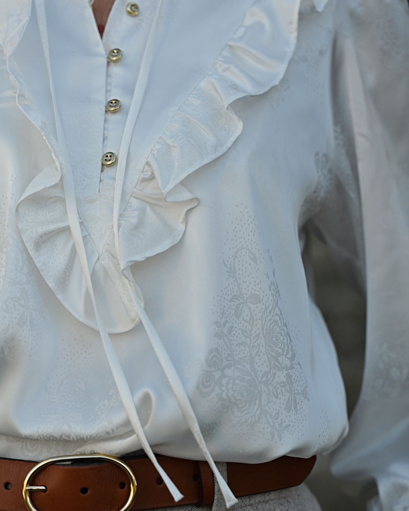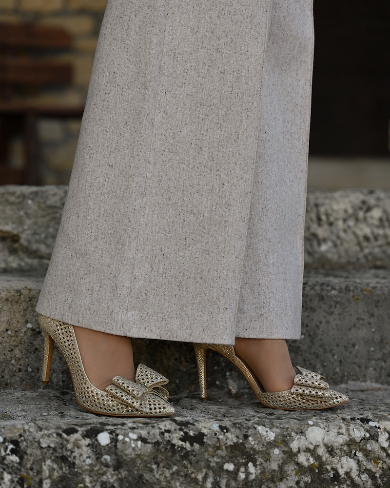Včasih si za popoln videz ne želimo pretiranega glamurja – dovolj je nekaj izbranih kosov, ki se med seboj harmonično dopolnjujejo. Tokrat je v ospredju klasična kombinacija širokih volnenih hlač v nežno bež barvi ter bele potiskane bluze z mehkimi, majhnimi volančki. Gre za silhueto, ki jo odlikujeta udobje in sofisticiranost, zato je primerna tako za vsakdanji korak po mestu kot tudi za bolj slavnostne trenutke. Širše hlače iz volne prinašajo občutek razkošja, obenem pa ustvarijo graciozno linijo, ki lepo zaokroži postavo. Ko se jim pridruži rahlo romantična bluza z volančki, nastane ravnovesje med strukturo in lahkotnostjo – močno ter nežno, natančno tako, kot se rada počuti sodobna ženska. Kombinacijo nadgradijo zlate čevlje, sijoč poudarek, ki subtilno ujame svetlobo in videzu doda pridih glamurja. Piko na i prinese torbica Rebecca Minkoff, posuta z motivi lune in zvezd. To je več kot le modni dodatek – je simbol, ki nas opomni, da je mogoče prav vse. Naj bo talisman za nove priložnosti, izzive in sanje, ki se šepetaje skrivajo v ozadju vsakega dne.