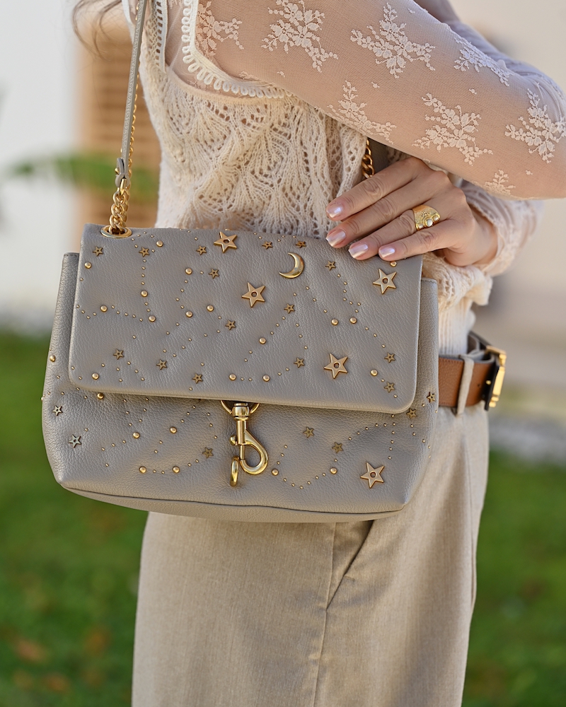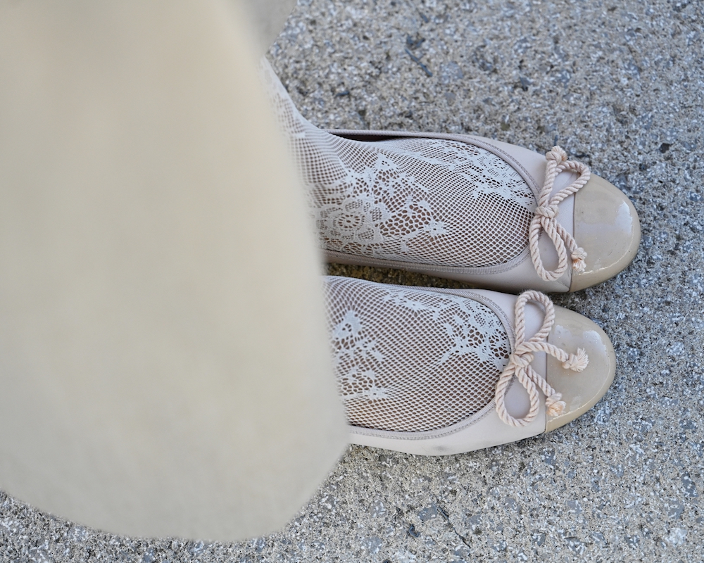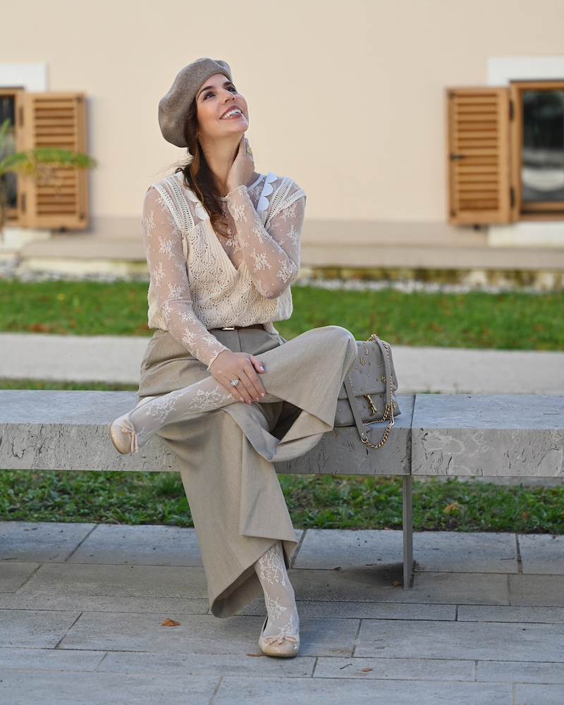 Moj stajling je sledeč: hlače Max Mara, nogavice Calzedonia, balerinke Pretty Ballerinas, brezrokavnik in čipkasta majica Anthropologie, čepica Rihoas, torbica Rebecca Minkoff.