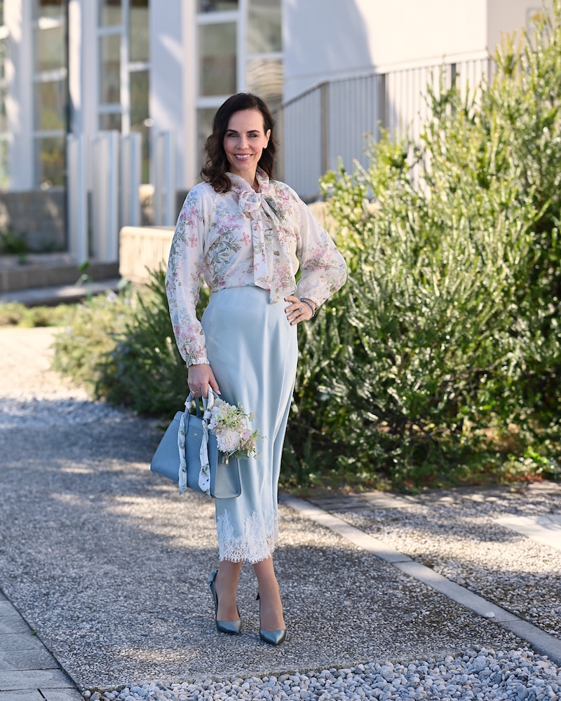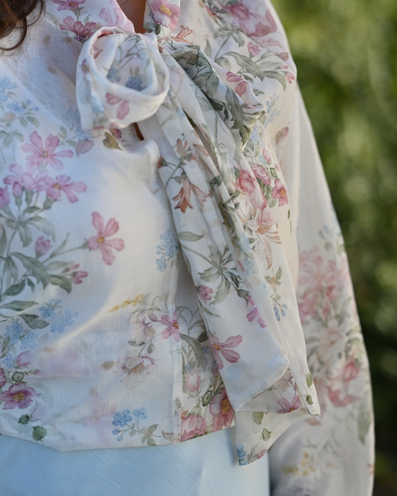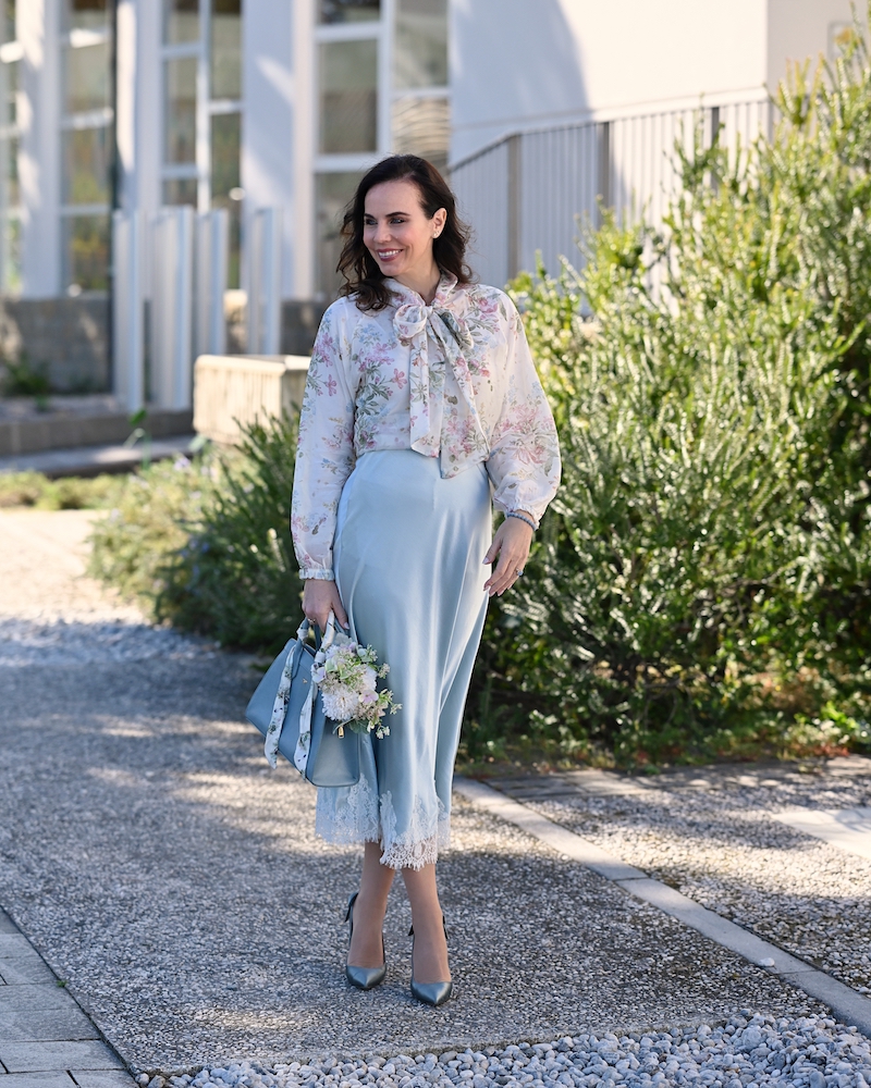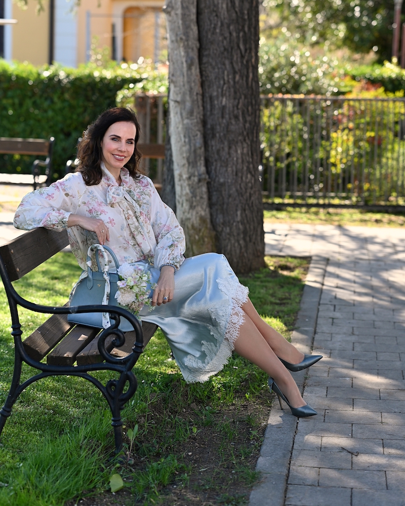 Bluza s pentljo je eden tistih kosov, ki v sebi nosijo brezčasno eleganco in nežno sporočilo ženstvenosti. Ko jo oblečem, imam občutek, kot da stopim v svet romantike, kjer detajli govorijo glasneje od besed. Pentlja ob vratu ni le modni dodatek, temveč simbol subtilne moči – tiste tihe, a samozavestne ženstvenosti, ki ne potrebuje pretiravanja. Celoten videz dopolnjuje midi krilo iz satena, ki s svojo sijočo teksturo ustvarja eleganten kontrast. Njegovo gibanje je tekoče, skoraj poetično, čipkast rob pa doda tisto piko na i – kanček zapeljivosti, ki ostaja prefinjen in nikoli pretiran.