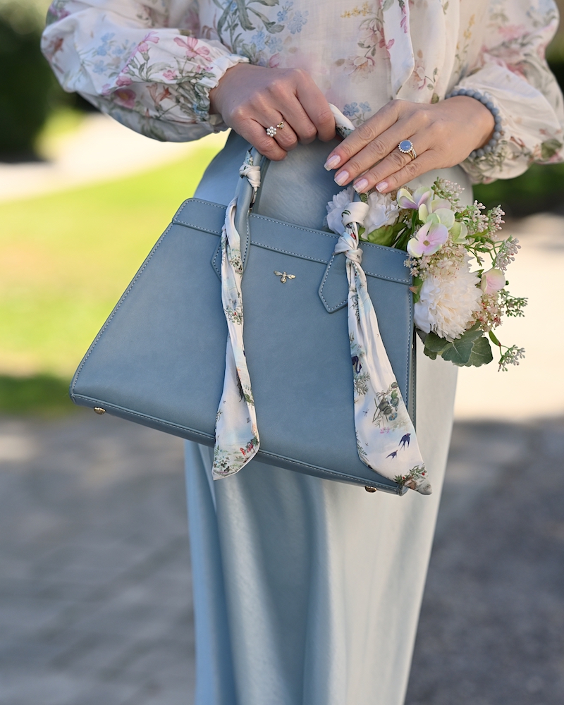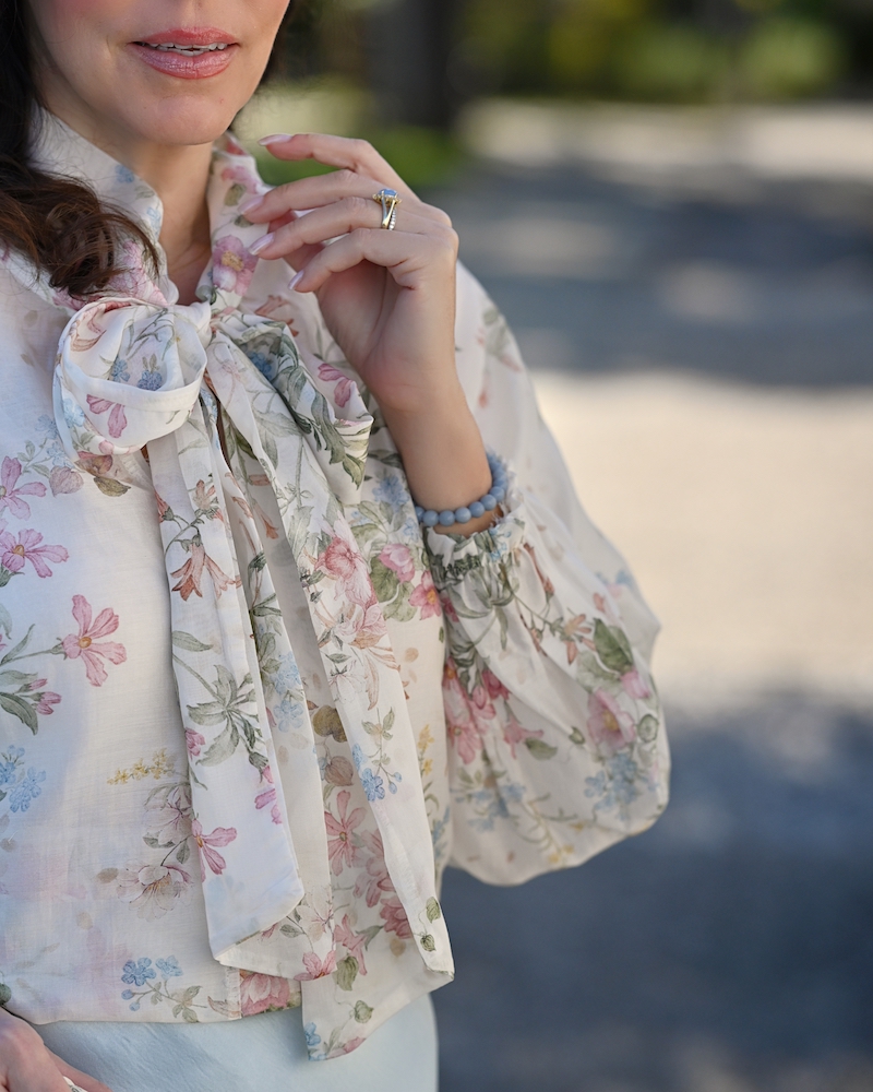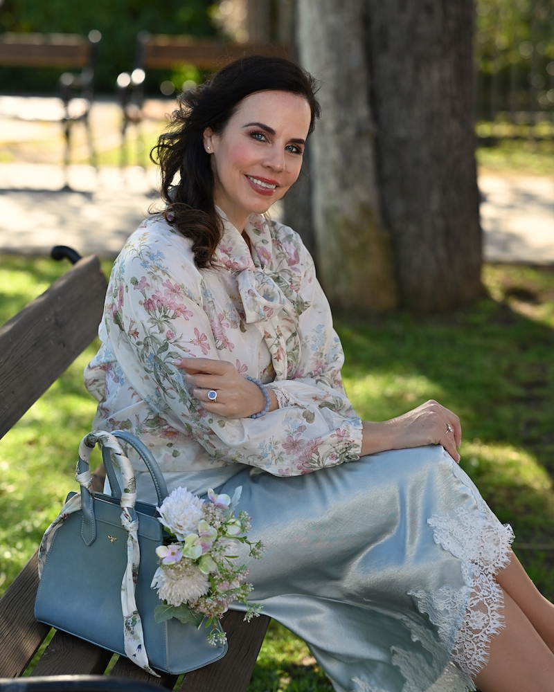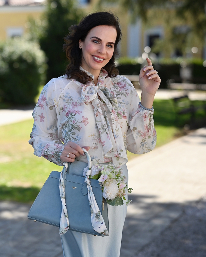 Bluza s pentljo je eden tistih kosov, ki v sebi nosijo brezčasno eleganco in nežno sporočilo ženstvenosti. Ko jo oblečem, imam občutek, kot da stopim v svet romantike, kjer detajli govorijo glasneje od besed. Pentlja ob vratu ni le modni dodatek, temveč simbol subtilne moči – tiste tihe, a samozavestne ženstvenosti, ki ne potrebuje pretiravanja. Celoten videz dopolnjuje midi krilo iz satena, ki s svojo sijočo teksturo ustvarja eleganten kontrast. Njegovo gibanje je tekoče, skoraj poetično, čipkast rob pa doda tisto piko na i – kanček zapeljivosti, ki ostaja prefinjen in nikoli pretiran.