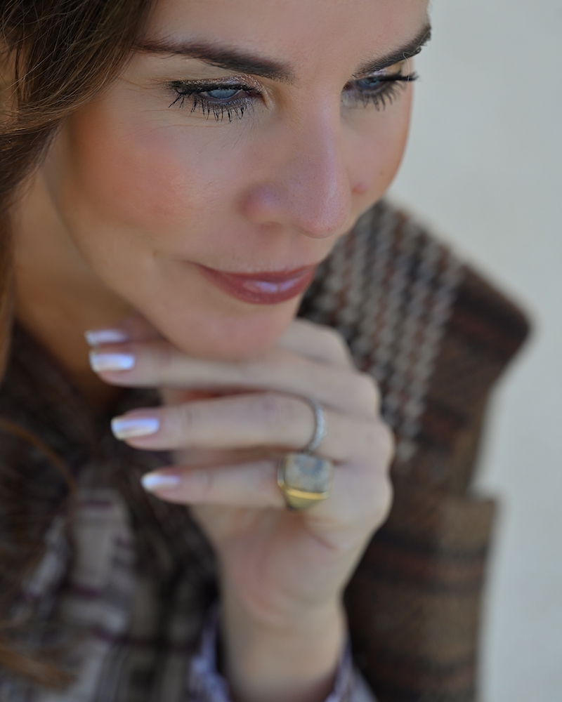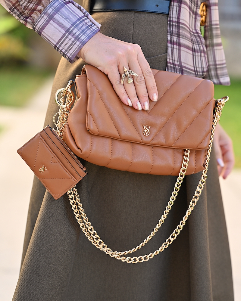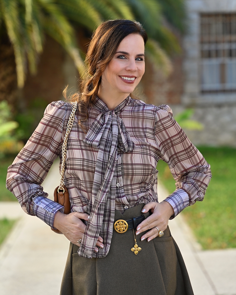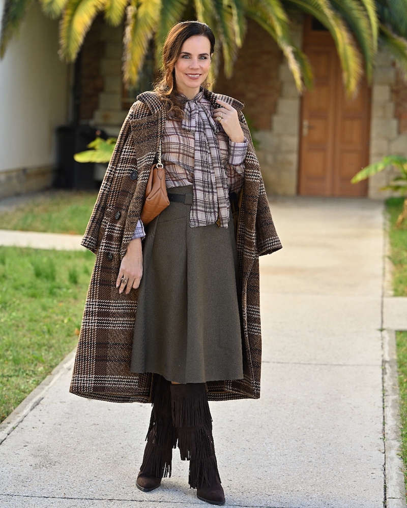 Danes sem se odločila za stajling, ki združuje udobje in eleganco. Osrednji kos je midi krilo, ki ga odlično dopolnjujejo škornji z resicami – kombinacija udobja in stila, saj imajo škornji pravo peto, ki poskrbi za ženstven korak brez kompromisov pri udobju. Zadnji pridih popolnosti daje plašč s karo vzorcem, ki celotnemu outfitu doda strukturo in klasično toplino. Moji najljubši rjavi odtenki skozi celoten stajling ustvarjajo občutek harmonije in sproščenosti, hkrati pa ostajajo popolnoma aktualni. To je popolna izbira za dan, ko želimo združiti udobje, toplino in eleganco v enem samem outfitu.