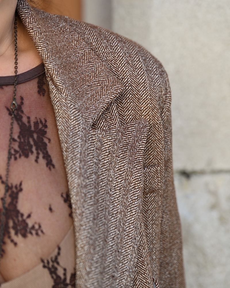 Danes sem se prepustila moči rjave barve – zimska klasika, ki me vedno ogreje in prinaša občutek varnosti. Nosim usnjene hlače in blazer, ki dajeta močan, prefinjen vtis, čipkast body pa doda kanček ženstvenosti in nežnosti. Psihološko rjava simbolizira stabilnost, zanesljivost in zemeljsko povezanost. V tem stajlingu se počutim samozavestno, prizemljeno in hkrati elegantno – barva, ki v hladnih mesecih nudi toplino tako vizualno kot notranje.