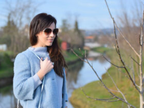 Kombinirala sem plašček z meni ljubim plisiranim krilom ter se poigrala z modro in zlato. Modna zgodba je nastala ob morju in kot običajno me je spremljal mir, saj je pozimi obala po svoje čudovita, ravno prav nostalgična in melanholična, da ti v hipu ukrade srce.