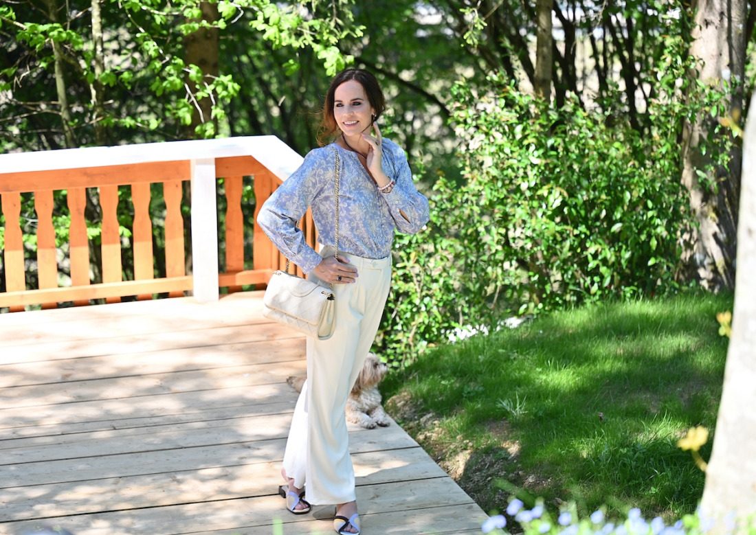 Za sproščen vsakdanji videz jo kombiniram s kavbojkami ali krilom, v tej izvedbi pa je s slonokoščenimi hlačami in nizkimi natikači, ki jih obožujem, saj so mi zelo drag spomin iz Miamija.