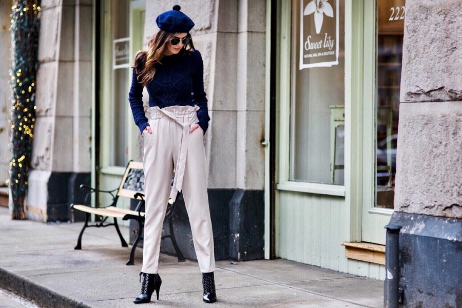 Paperbag hlače imajo lahko različne oblike in dolžine, njihova skupna točka pa ostaja visok pas s pentljo.