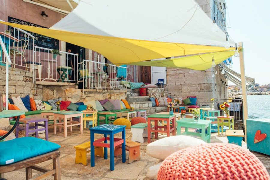 Nahaja se v Rovinju, na skalah, z barvitimi stoli in pogledom na morje.