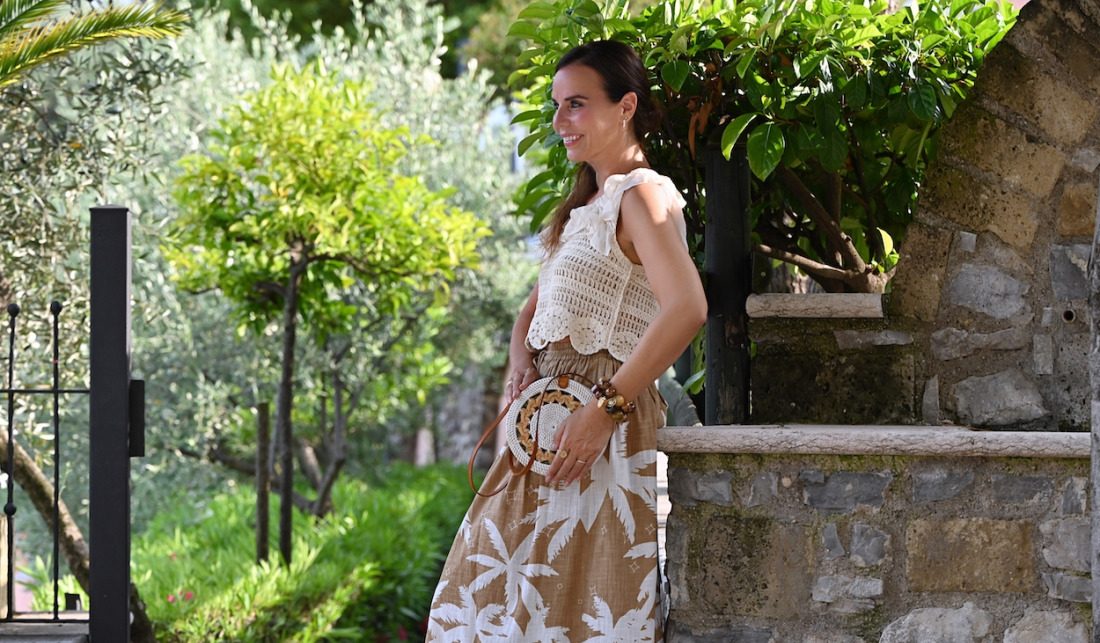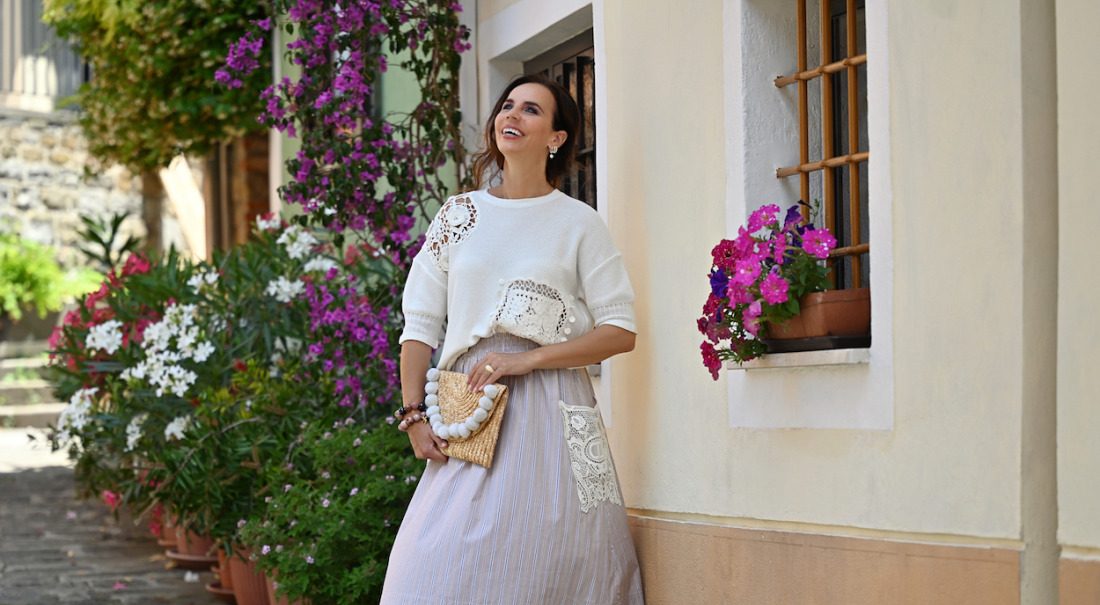 Celoten videz je sproščen, a hkrati eleganten, popoln za poletne dni, ko se prepletata lahkotnost in brezskrbnost.