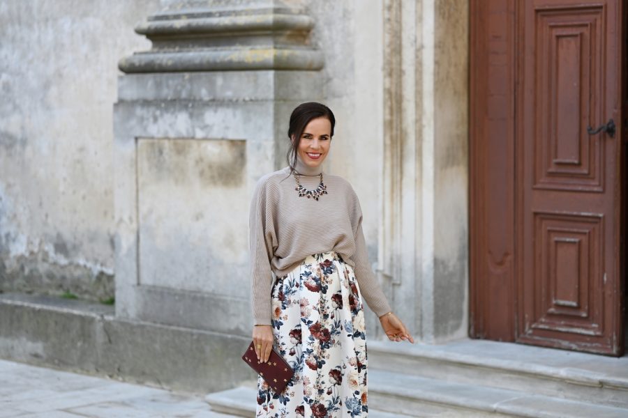 Čipkasto krilo v kombinaciji s pletenim puloverjem, okrašenim z vrtnicami, prepleta toplino in nežno romantiko.