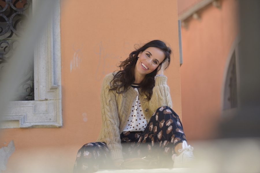 Kombinirala sem jo na zelo enostaven način, in sicer z belimi hlačami z visokim pasom, obula visoke pete in izbrala torbico s čebelami, za dobro voljo.
