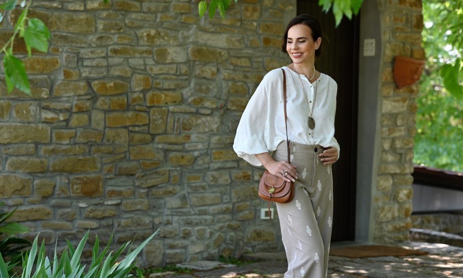 Današnji stajling dneva zaznamuje dolga lanena obleka v oranžni barvi – lahkotna, zračna in izjemno poletna.
