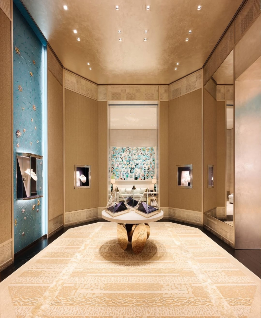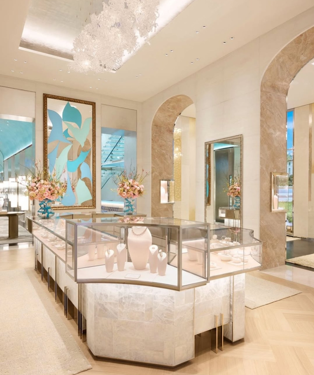 Med arhitekturnimi rešitvami in prefinjenimi interierji so razstavljena dela umetnikov, kot so Michelangelo Pistoletto, Urs Fischer, Daniel Arsham in Julian Schnabel, kar ustvarja dialog med umetnostjo in draguljarstvom. Osrednji arhitekturni element je spektakularna strukturna stopniščna skulptura iz stekla, zasnovana po ideji studia Marino, projektirana pa s strani arhitekta Hugha Duttona. Ta element ne povezuje le nadstropij, temveč simbolično povezuje dediščino in sodobnost. Drugo nadstropje je posvečeno ljubezni. Prostor All About Love slavi ikonični zaročni prstan Tiffany Setting, univerzalni simbol obljube in večne predanosti. Ambient je intimen, čustven in izjemno sofisticiran. Zadnje nadstropje je namenjeno zasebnim salonom, kjer je nakupovanje doživetje po meri – diskretno, osebno in v skladu z najvišjimi standardi luksuza. Vsak detajl je premišljen, vsak prostor ima svojo zgodbo.