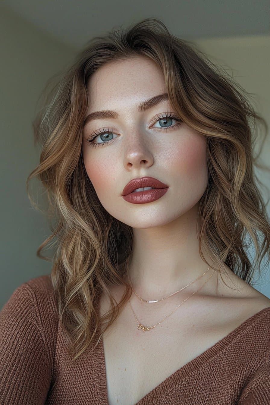 - Topla šminka – namesto hladne rdeče raje izberi šminko v opečnati, karameli ali nežni rožnato-rjavi.
