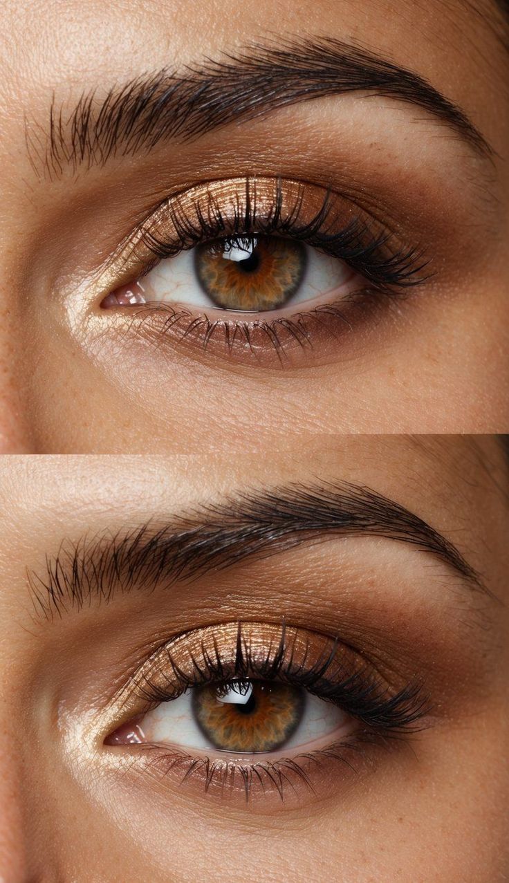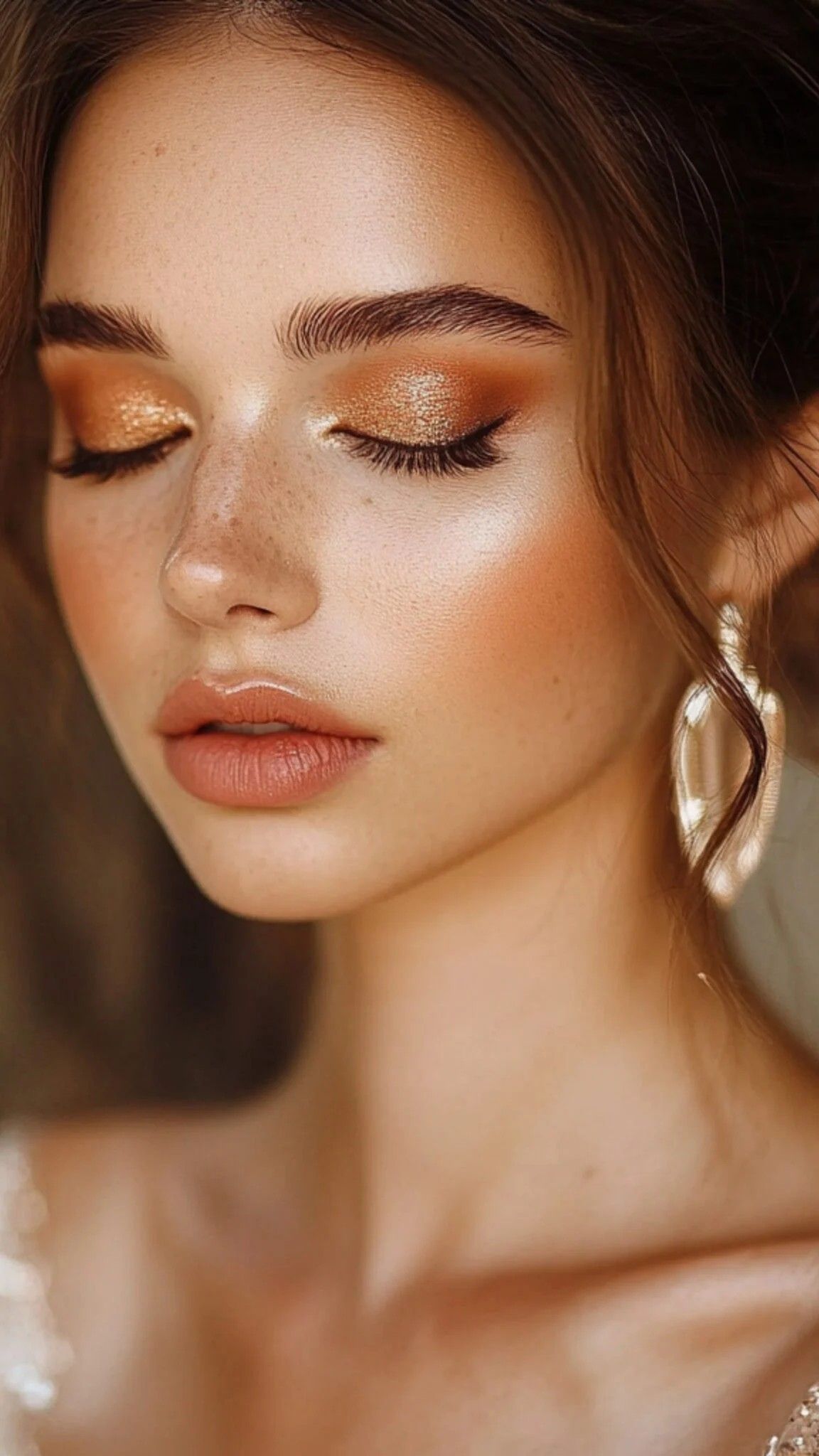 - Naravni sijaj: rahlo sijoči bronzer ali toplo zlato senčilo v kotičkih oči vrača sijaj in svežino, ki pomlajuje.