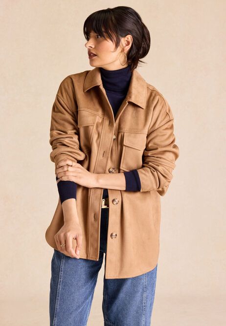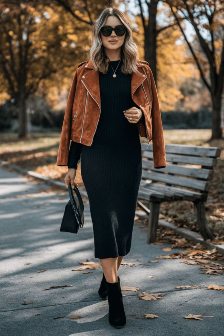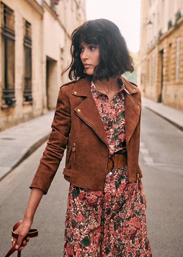 Semiš lepo zmehča ženstvenost obleke. Midi obleka s cvetličnim potiskom in semiš jakna je popoln par za romantične jesenske sprehode.