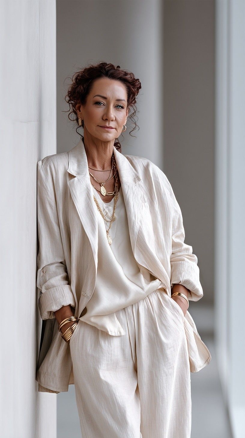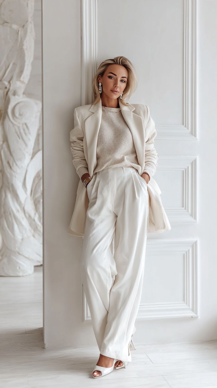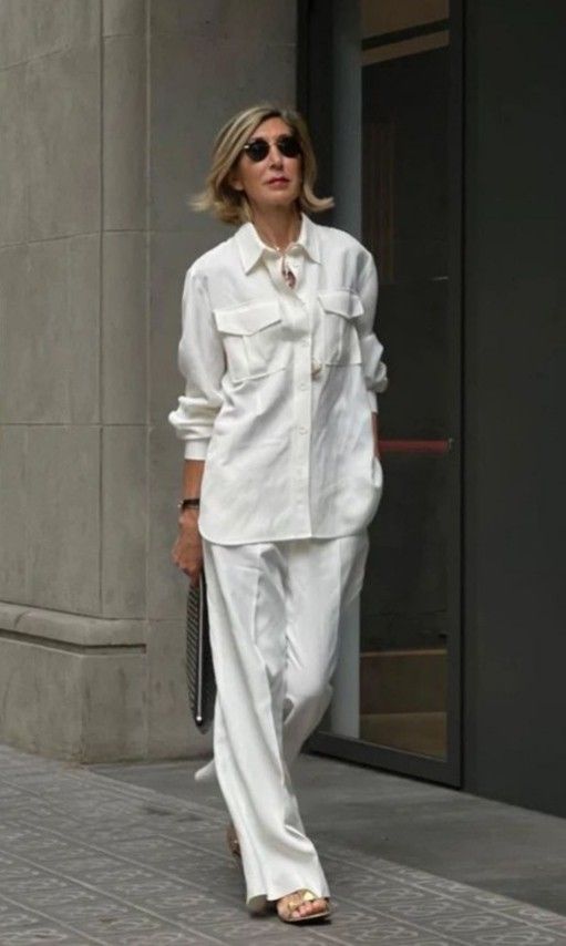 Odličen primer prihaja iz sveta slavnih. Igralka Cameron Diaz se je nedavno pojavila v popolnoma belem videzu modne hiše Calvin Klein in pokazala, kako brezčasna je ta kombinacija. Nosila je širok krojen kostim: blazer z izrazitimi rameni, svileno majico in hlače z visokim pasom in širokimi hlačnicami, ki ustvarjajo občutek gibanja in lahkotnosti. Silhueta je bila popolno ravnovesje med strukturo in fluidnostjo, kar daje videzu sodoben, a zelo eleganten značaj. Takšen videz dokazuje, da je bela lahko izjemno močna modna izjava – še posebej po petdesetem letu.