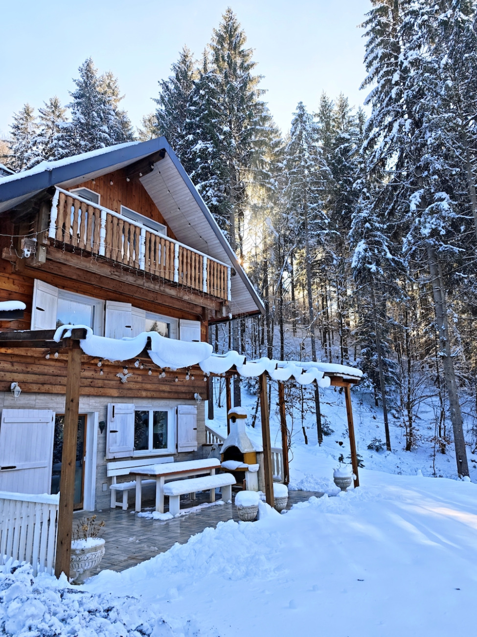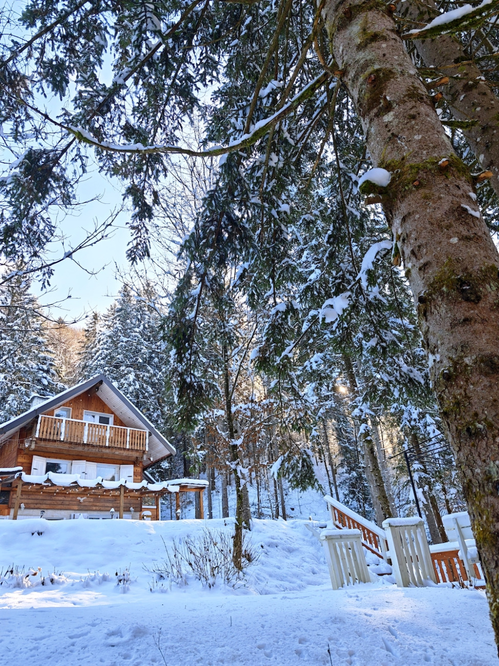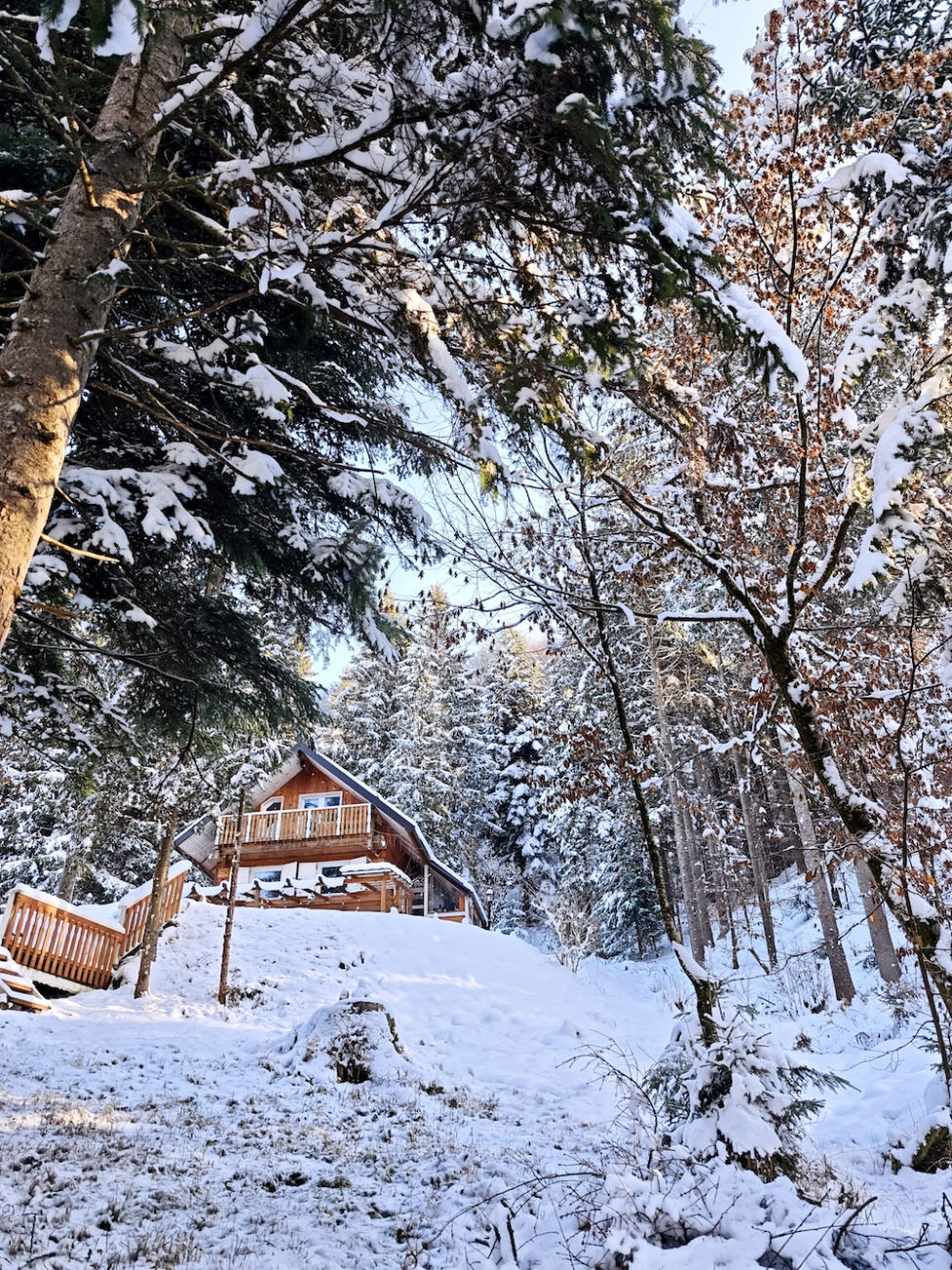Zavita v topel plašč stojim na terasi. Mraz se poglablja, a me ne moti. Nasprotno – prizemljuje me. Svetloba snega obdaja hišo v gozdu, ki postaja skoraj eterična, kot da lebdi med resničnostjo in sanjami.