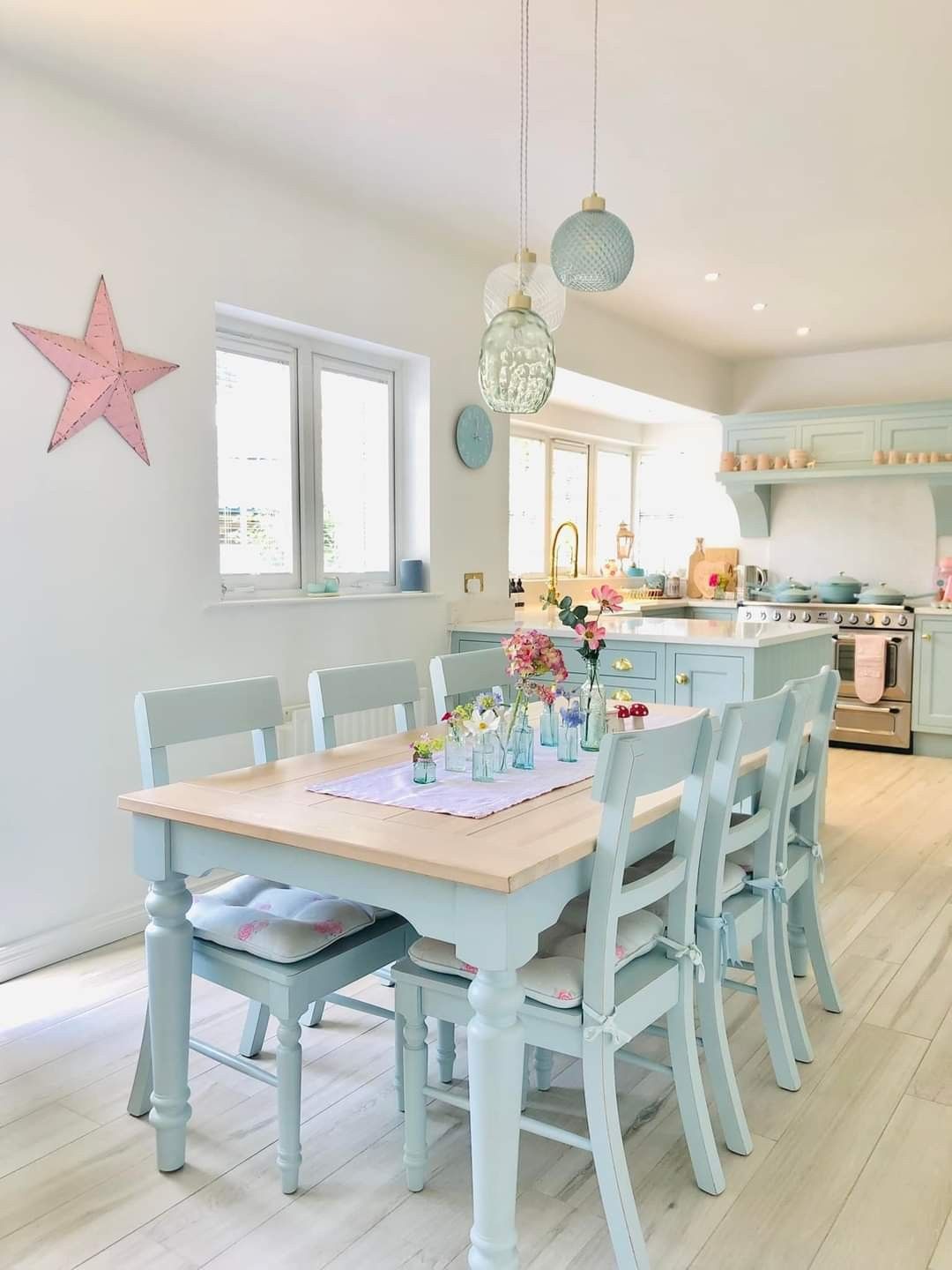 - Če so stene in omare svetle nevtralne → stoli v pastelnih modrih ali mint‑zelenih tonih.