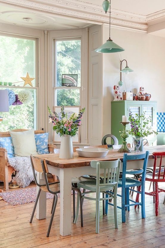 - Če je kuhinjska miza dolga in ima 6 stolov, izberite 4 stolov v nevtralni barvi in 2 (na koncih) v barviti – tako bo barviti poudarek poudaril ‘glavni del’.