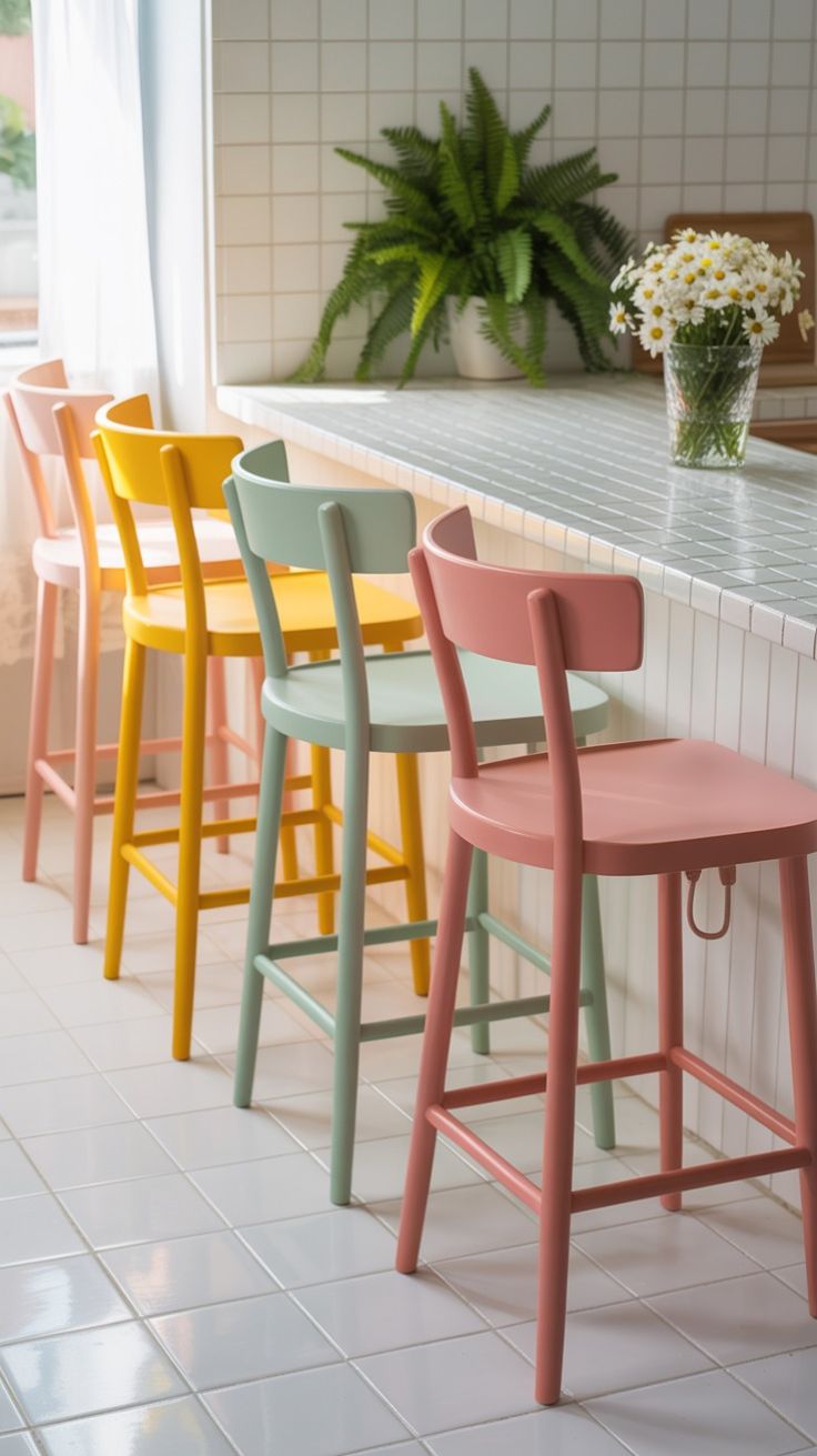 Stoli so pogled‑usmeritveni kos: izberite barvo, ki pritegne pogled, morda nasproti stene ali otoka. To je še posebej primerno, če kuhinja nima velikega “izstopajočega” elementa.