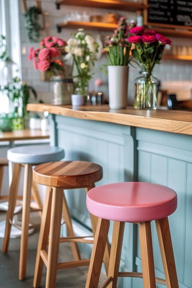 Stoli so pogled‑usmeritveni kos: izberite barvo, ki pritegne pogled, morda nasproti stene ali otoka. To je še posebej primerno, če kuhinja nima velikega “izstopajočega” elementa.