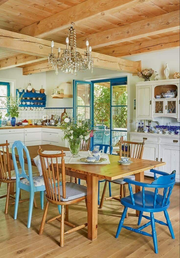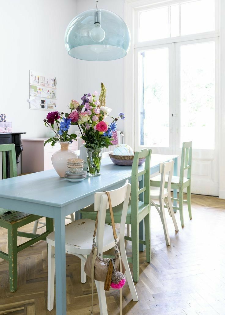- Če so stene in omare svetle nevtralne → stoli v pastelnih modrih ali mint‑zelenih tonih.
