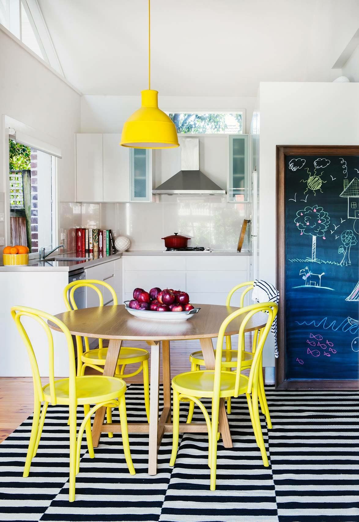 Kadar kuhinja/prebivalni prostor vključuje otok ali jedilno mizo, barviti stoli lahko definirajo “jedilni del” in ga ločijo vizualno od delovne kuhinje.