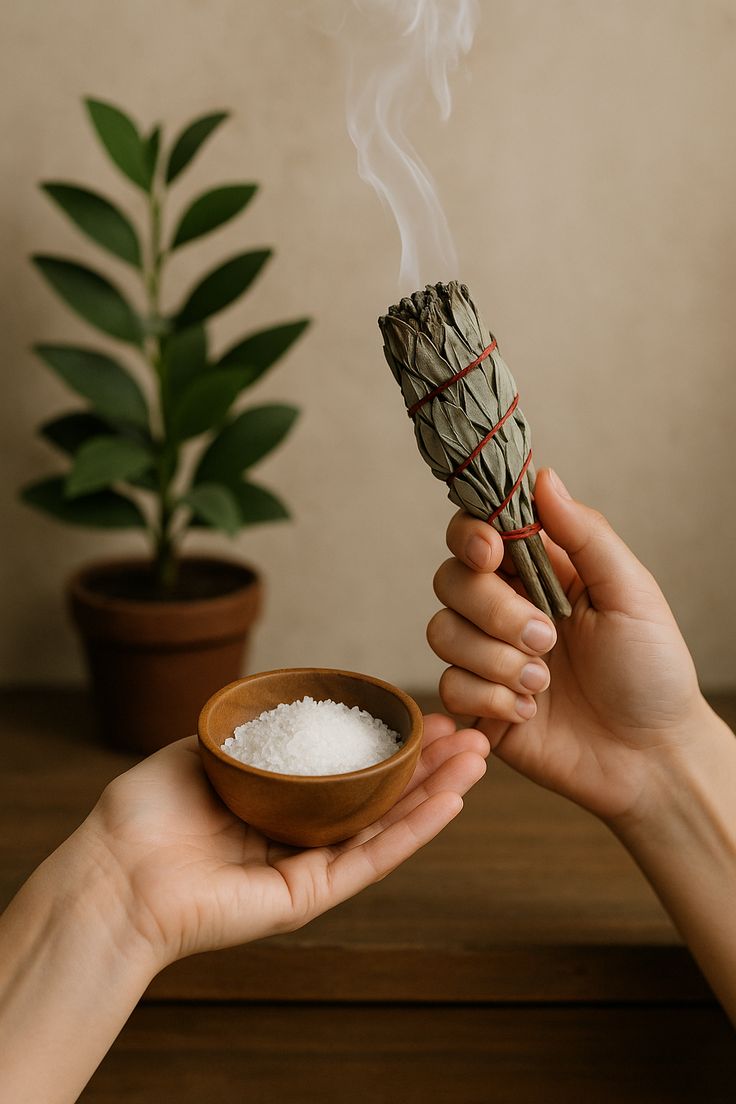 - Izberi žajbelj – suhe liste ali svežo vejico; če je bel žajbelj (white sage), bodi pozoren na izvor in etično pridobivanje.